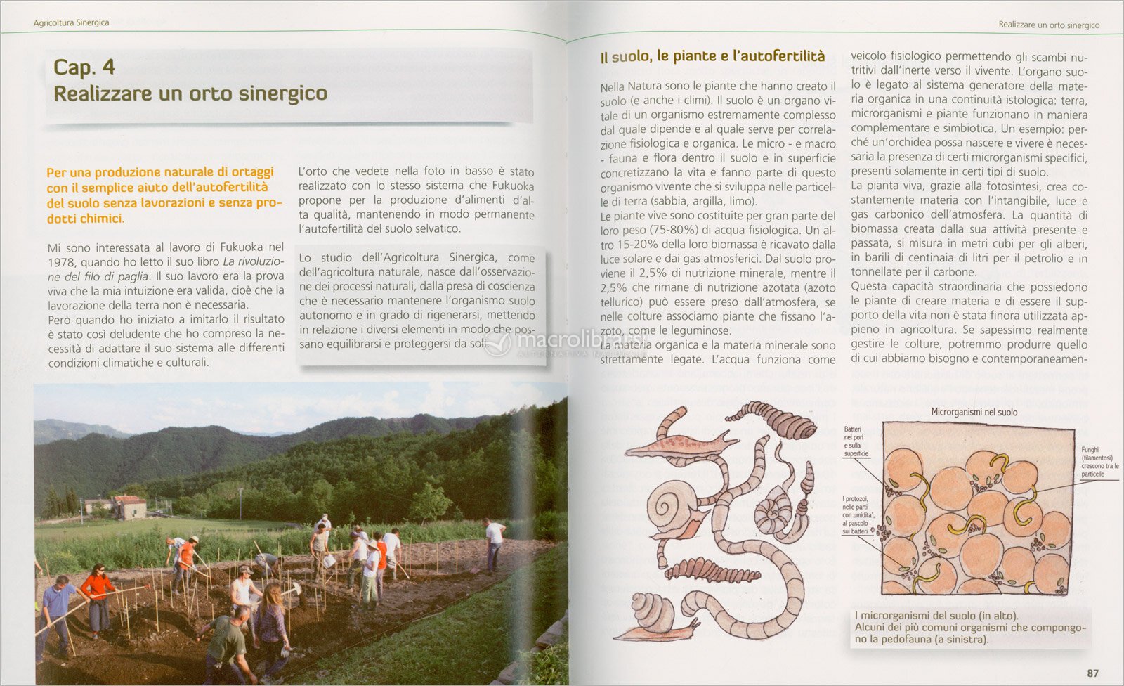 Nel libro vengono illustrati in modo chiaro i principi fondamentali dell’agricoltura sinergica: la rinuncia alla lavorazione del suolo, l’uso della pacciamatura per proteggere e nutrire la terra, la creazione di aiuole rialzate permanenti e l’importanza delle relazioni tra le piante.