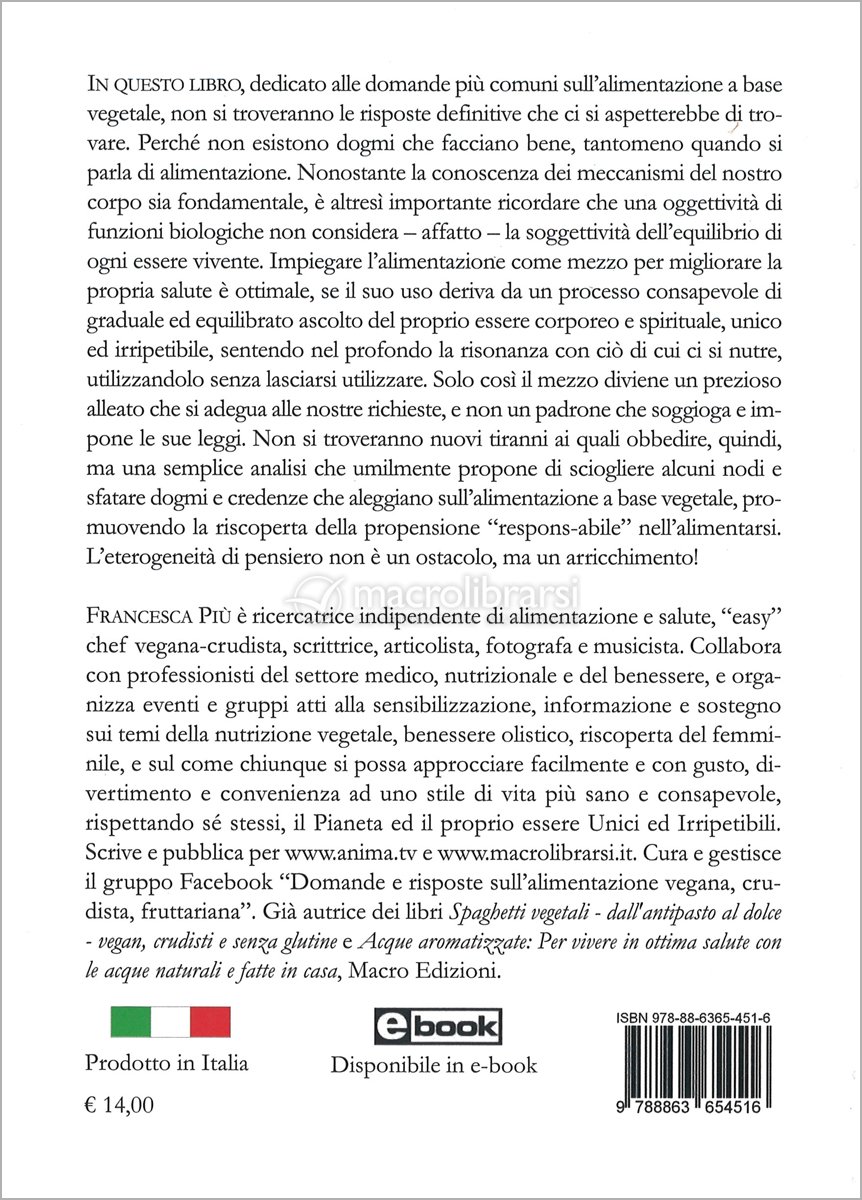 In questo libro, dedicato alle domande più comuni sull’alimentazione a base vegetale, non si troveranno le risposte definitive che ci si aspetterebbe di trovare. Perché non esistono dogmi che facciano bene, tantomeno quando si parla di alimentazione. Nonostante la conoscenza dei meccanismi del nostro corpo sia fondamentale, è altresì importante ricordare che una oggettività di funzioni biologiche non considera – affatto – la soggettività dell’equilibrio di ogni essere vivente.