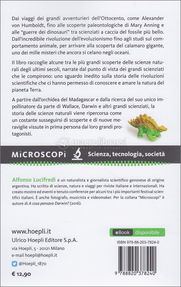 Dai viaggi dei grandi avventurieri dell'Ottocento, come Alexander von Humboldt, fino alle scoperte paleontologiche di Mary Anning e alle "guerre dei dinosauri" tra scienziati a caccia del fossile più bello. Dall'incredibile rivoluzione dell'evoluzionismo fino agli studi sul comportamento animale, per arrivare alla scoperta del calamaro gigante, uno dei mille misteri che ancora si celano negli oceani.
