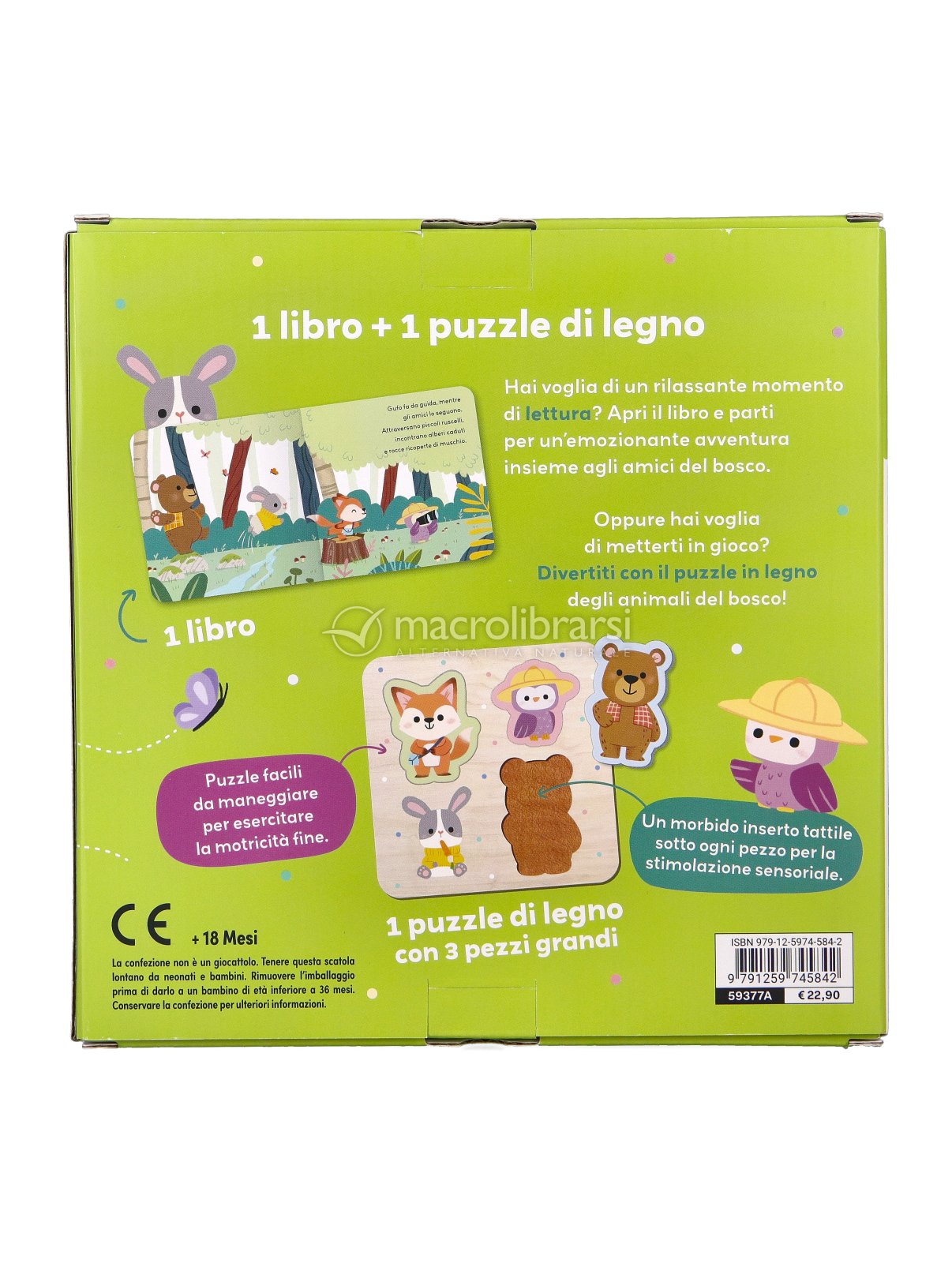 Il libro cartonato e illustrato racconta in modo semplice e coinvolgente la storia degli animali del bosco mentre i bambini possono esplorare un supporto di legno con tre piccoli puzzle dei personaggi, sollevando ogni pezzo per scoprire inserti tattili sotto di essi.