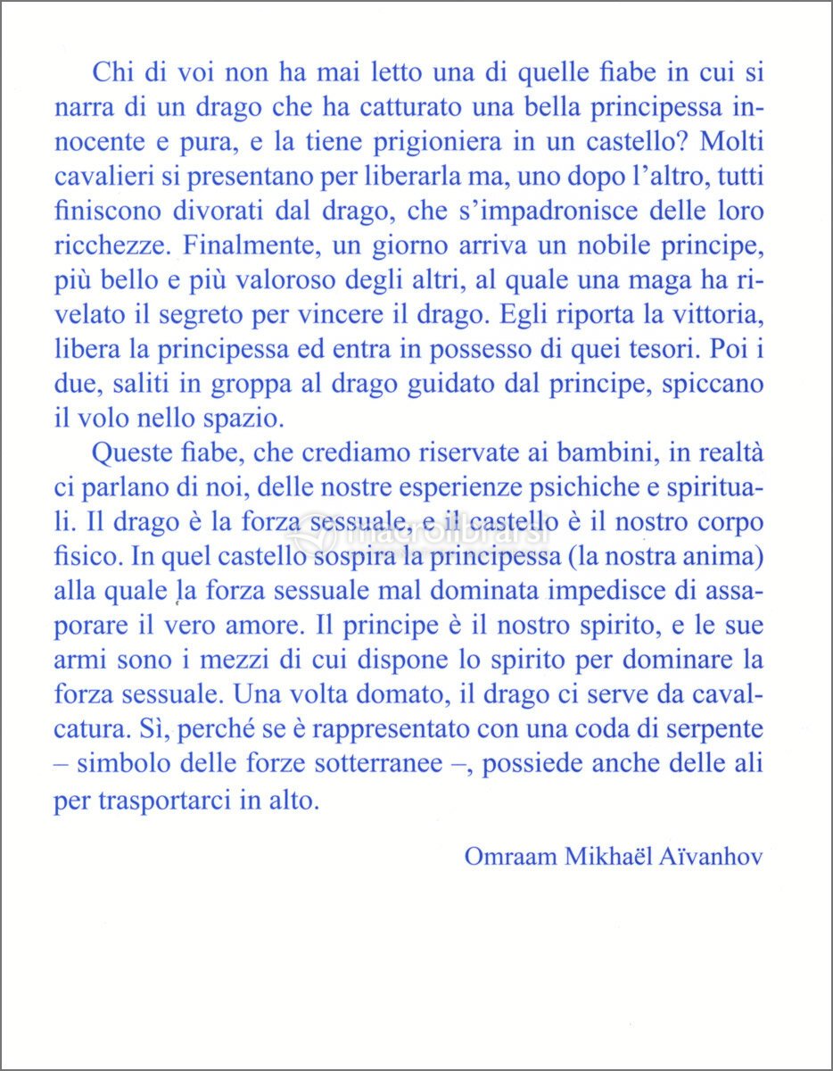 Il drago è la forza sessuale, e il castello è il nostro corpo fisico. In quel castello sospira la principessa (la nostra anima) alla quale la forza sessuale mal dominata impedisce di assaporare il vero amore. Il principe è il nostro spirito, e le sue armi sono i mezzi di cui dispone lo spirito per dominare la forza sessuale. Una volta domato, il drago ci serve da cavalcatura. Sì, perché se è rappresentato con una coda di serpente, simbolo delle forze sotterranee, possiede anche delle ali per trasportarci in alto.