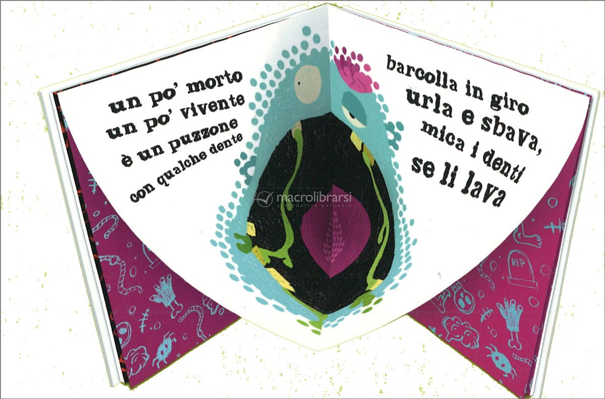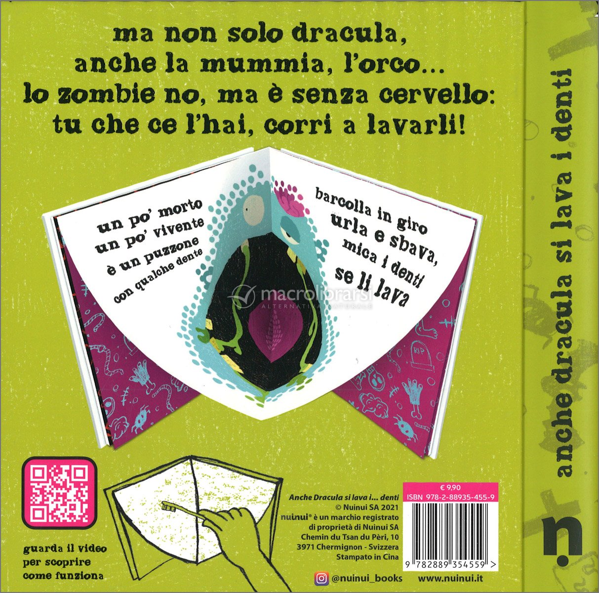 Il libro, che termina con una lezione sulla nostra bocca e sull'importanza di prendersene cura, comprende molti esempi curiosi e tante parole interessanti. L'autore ha inventato un gioco divertente da fare prima di andare a dormire. I testi sono in rima e la forma speciale, ma estremamente semplice, del libro permette di mettere la mano (o anche un piede o la testa) nella bocca del mostro: così genitori e figli possono giocare tutti insieme. Oltre che a Dracula, i bambini possono lavare i denti anche a un orco, a una mummia, a un lupo mannaro...