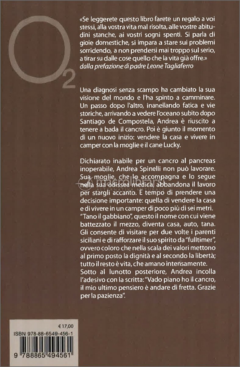 Una diagnosi senza scampo ha cambiato la sua visione del mondo e l’ha spinto a camminare. Un passo dopo l’altro, inanellando fatica e vie storiche, arrivando a vedere l’oceano subito dopo Santiago de Compostela, Andrea è riuscito a tenere a bada il cancro. Poi è giunto il momento di un nuovo inizio: vendere la casa e vivere in camper con la moglie e il cane Lucky.