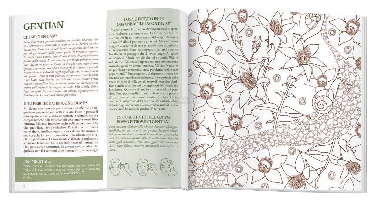 Questo è un libro “terapeutico”, sono molto originali ed evocative le descrizioni dei fiori, molto interessante la possibilità di colorare i disegni prestampati dei singoli fiori.