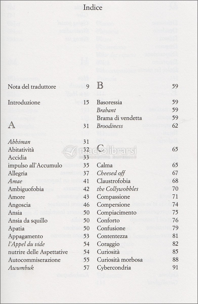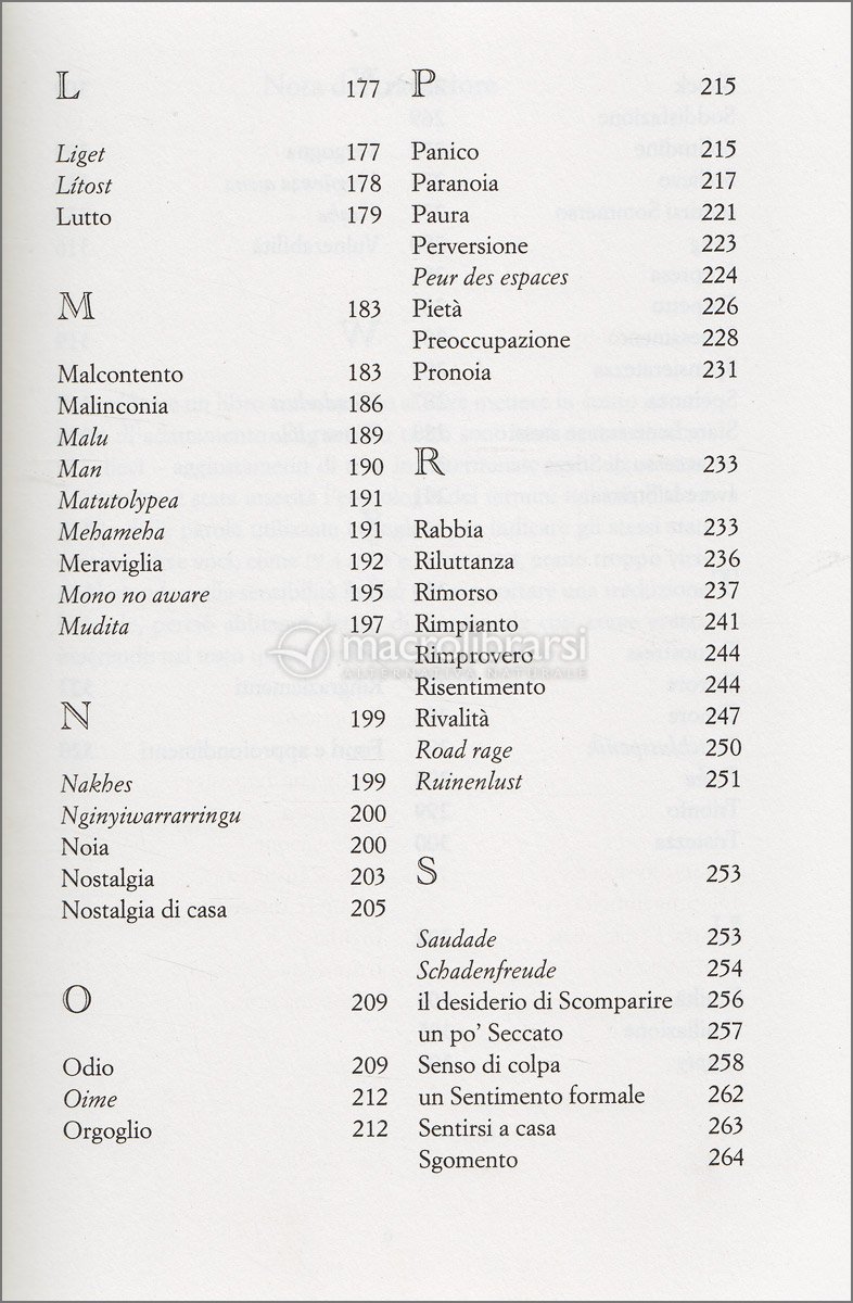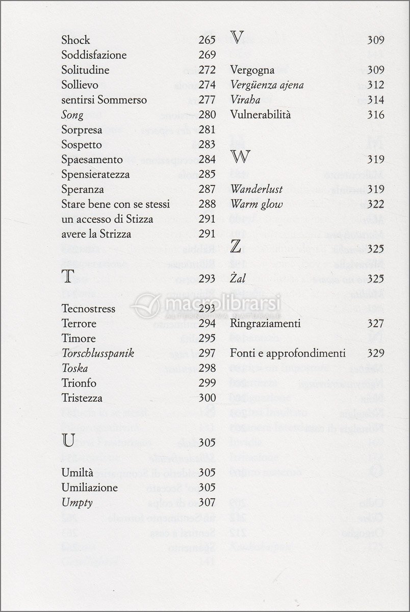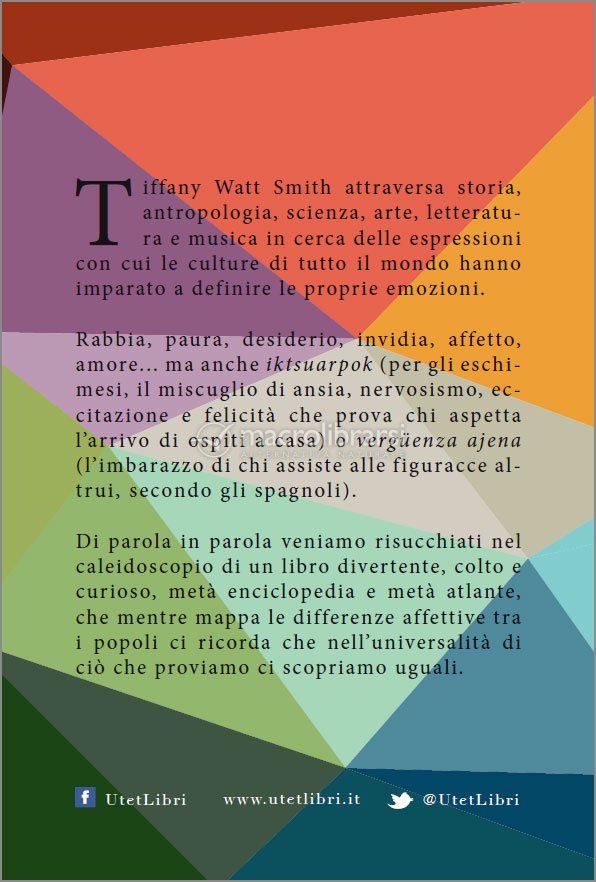 Di parola in parola veniamo risucchiati nel caleidoscopio di un libro divertente, colto e curioso, metà enciclopedia e metà atlante, che mentre mappa le differenze affettive tra i popoli ci ricorda che nell'universalità di ciò che proviamo ci scopriamo uguali.