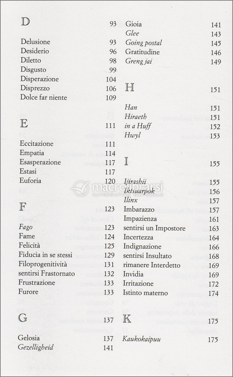 Contiene moltissime emozioni che nemmeno conoscevo. Mi aspettavo di trovare anche quello più comuni o che personalmente ho conosciuto invece ne ho trovate molte altre sconosciute. Molto interessante.