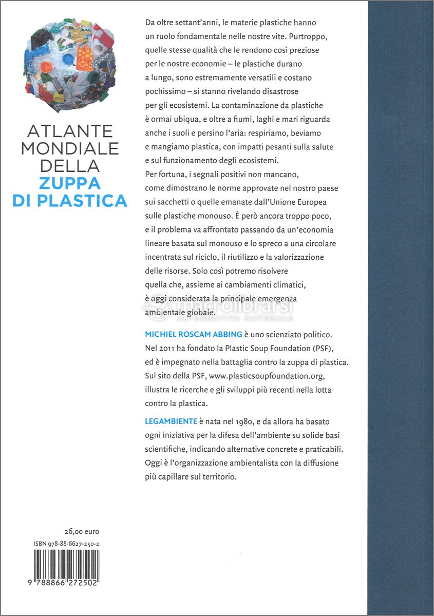 L’edizione italiana dell’Atlante mondiale della zuppa di plastica è realizzata in collaborazione con Legambiente, da anni in prima linea contro il marine litter, con campagne come Goletta Verde e Spiagge Pulite. Legambiente curerà un nuovo capitolo, appositamente realizzato per l’edizione italiana, dedicato alla situazione dei nostri mari e dell’intero bacino Mediterraneo.