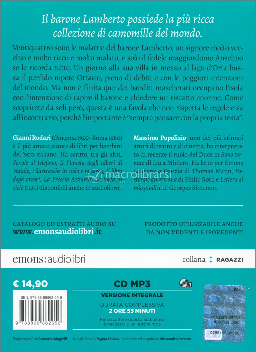Ventiquattro sono le malattie del barone Lamberto, un signore molto vecchio e molto ricco e molto malato, e solo il fedele maggiordomo Anselmo se le ricorda tutte. Un giorno alla sua villa in mezzo al lago d’Orta bussa il perfido nipote Ottavio, pieno di debiti e con le peggiori intenzioni del mondo. Ma non è finita qui: dei banditi mascherati occupano l’isola con l’intenzione di rapire il barone e chiedere un riscatto enorme. Come scoprirete da soli però, questa è una favola che non rispetta le regole e va all’incontrario, perché l’importante è “sempre pensare con la propria testa”.