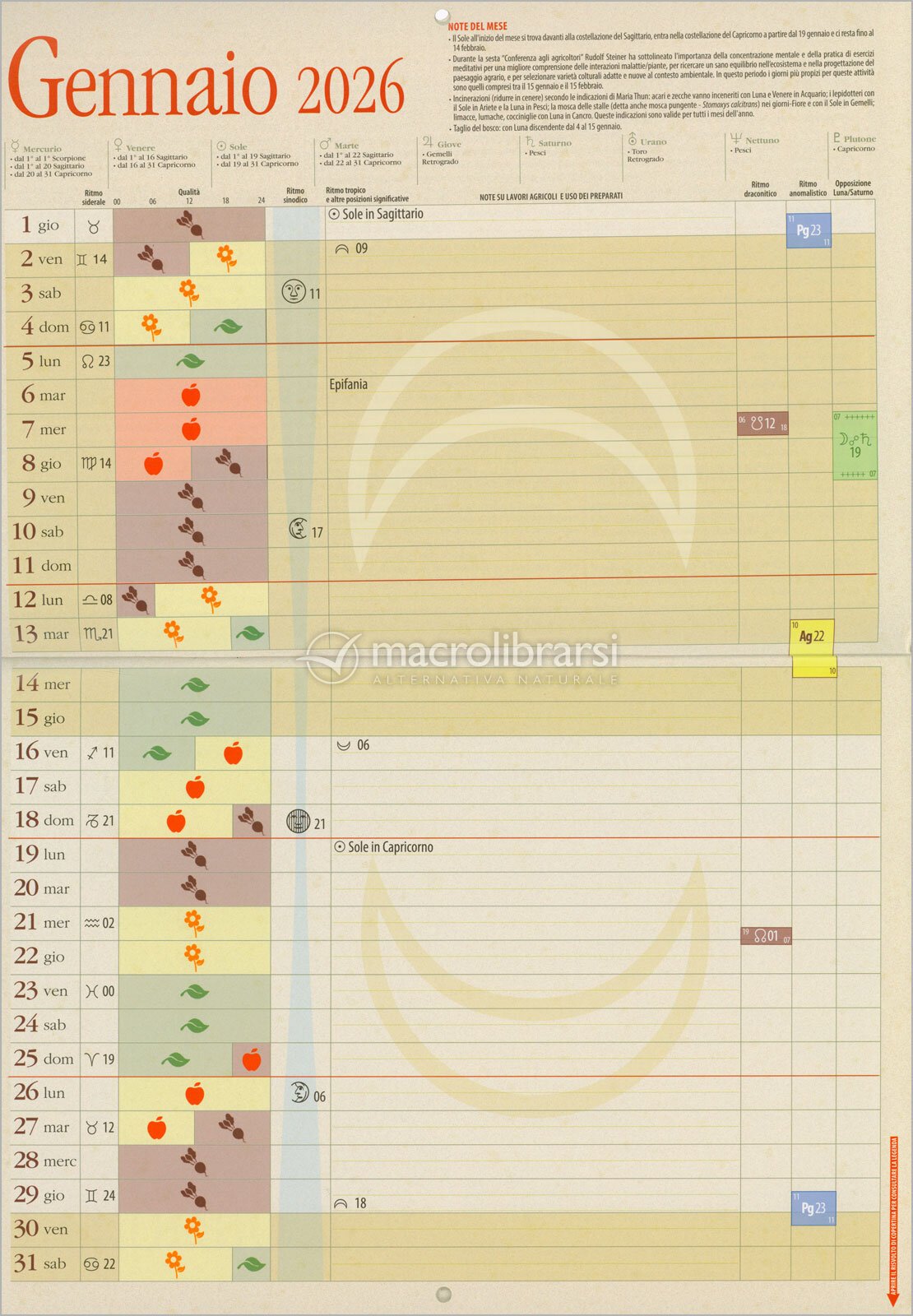 Il Calendario 2026 è ideato per evidenziare con precisione, per ogni giorno dell'anno, gli influssi della Luna e degli altri astri sui lavori agricoli.