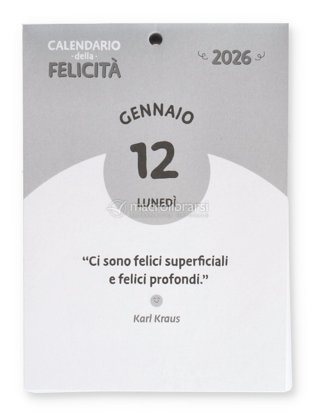 Il Calendario della Felicità 2026 è un compagno quotidiano di ispirazione: giornaliero a strappo, utilizzabile sia da tavolo sia da parete, raccoglie le più belle citazioni sulla felicità per iniziare ogni giornata con uno sguardo luminoso.