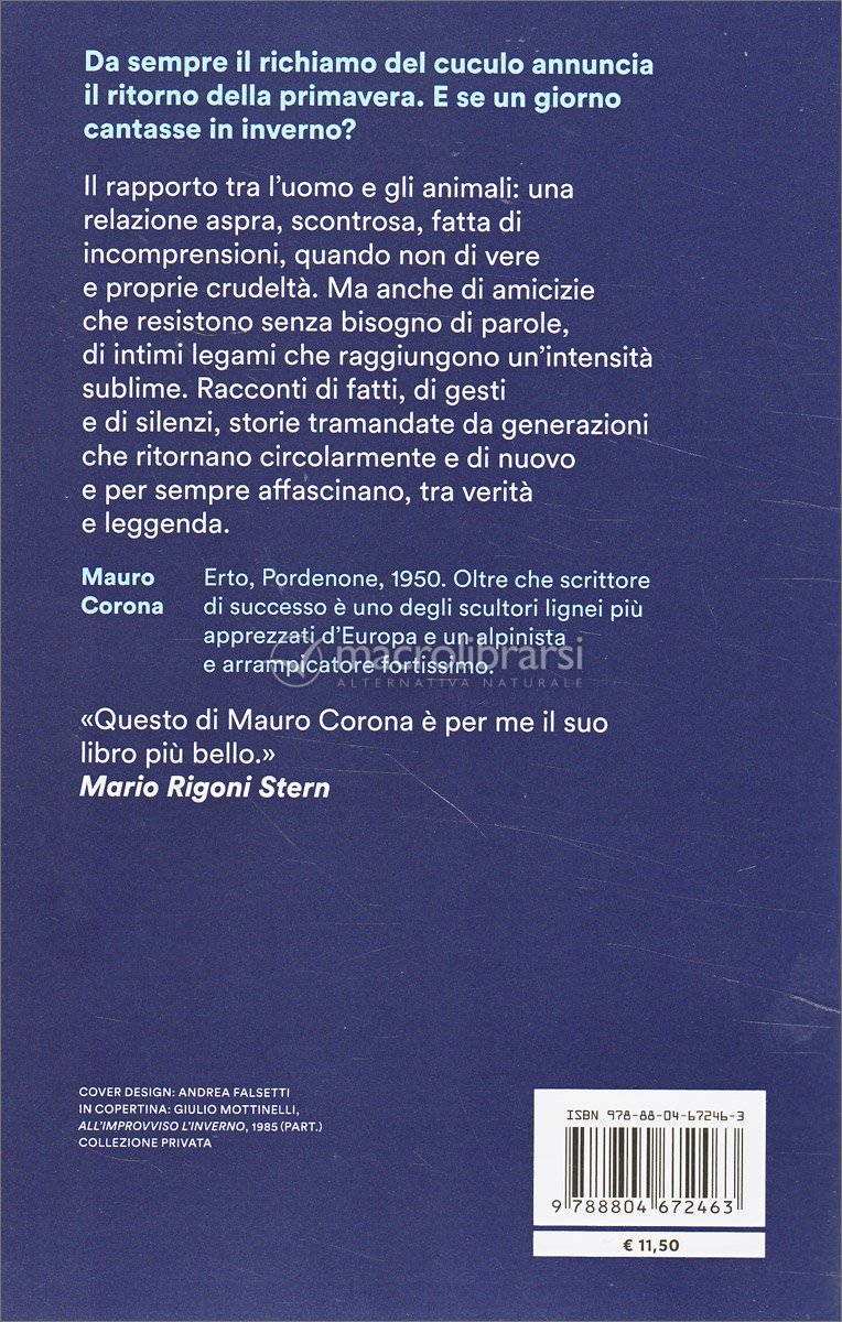 Ritengo che Mauro Corona sia uno scrittore italiano davvero eccezionale. Questo romanzo è di una freschezza inaudita e leggerlo si rivela fin da subito un respirare a pieni polmoni aria fresca e vitale. E' un libro che emana amore per ogni cosa, non solo per gli animali, presso cui lo scrittore ha dato prova di una passione toccante e grande. La particolarità dei libri di Corona è quella di raccontarci di storie lontane dal nostro quotidiano, ma che si avvicinano molto al nostro cuore. Personaggi carismatici e dotati di una strabiliante intelligenza oltre che di bontà e di amore incondizionato per la natura e per l'universo stesso. Leggete anche "La fine del mondo storto", a mio avviso il capolavoro di questo grande scrittore.
