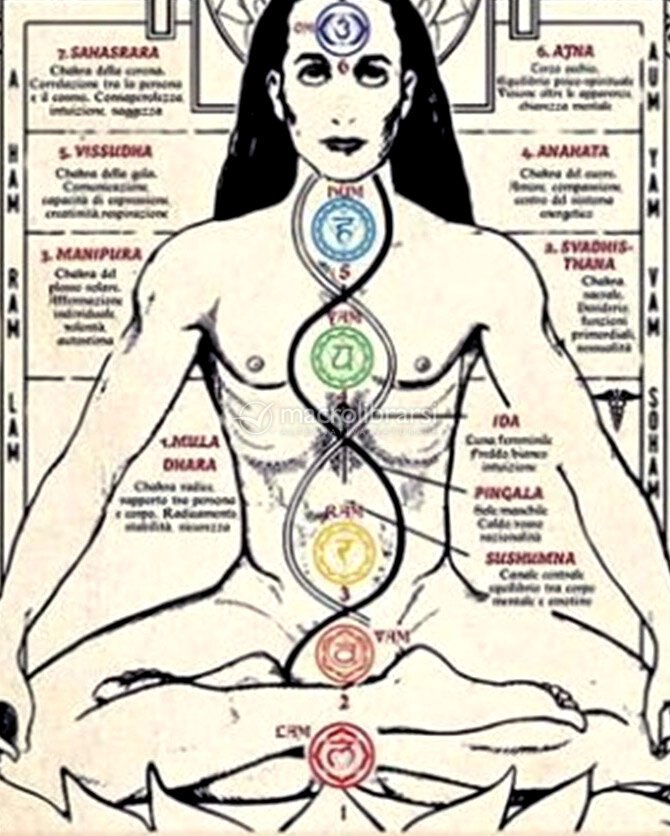 Nella figura centrale trovi i sette chakra allineati lungo la colonna vertebrale