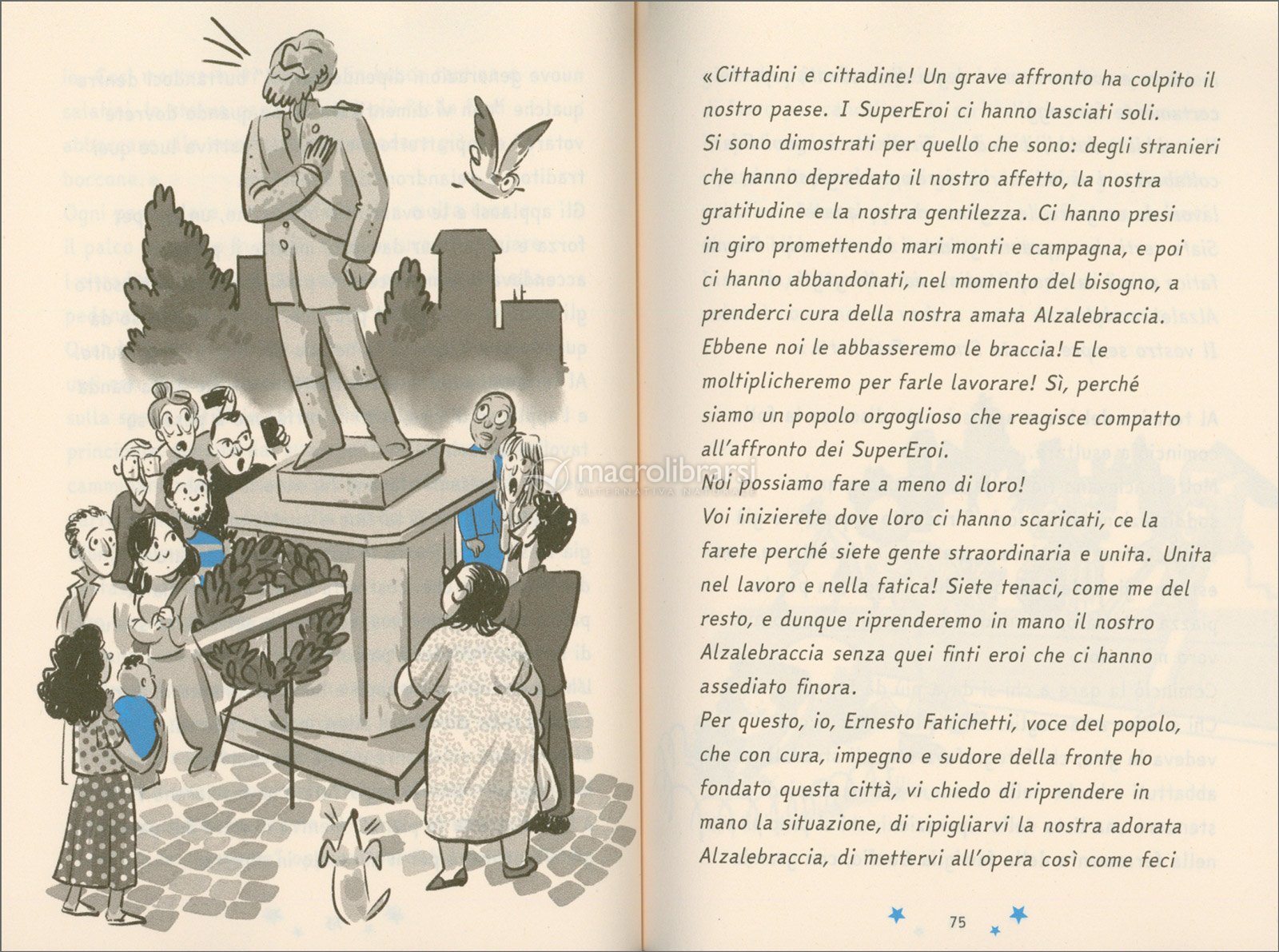 E sì, perché gli alzalebraccesi sono diventati pigri e non alzano più un dito per prendersi cura delle cose di tutti, tanto ci sono i Supereroi! E così un bel giorno, i Supereroi decidono di fare sciopero.