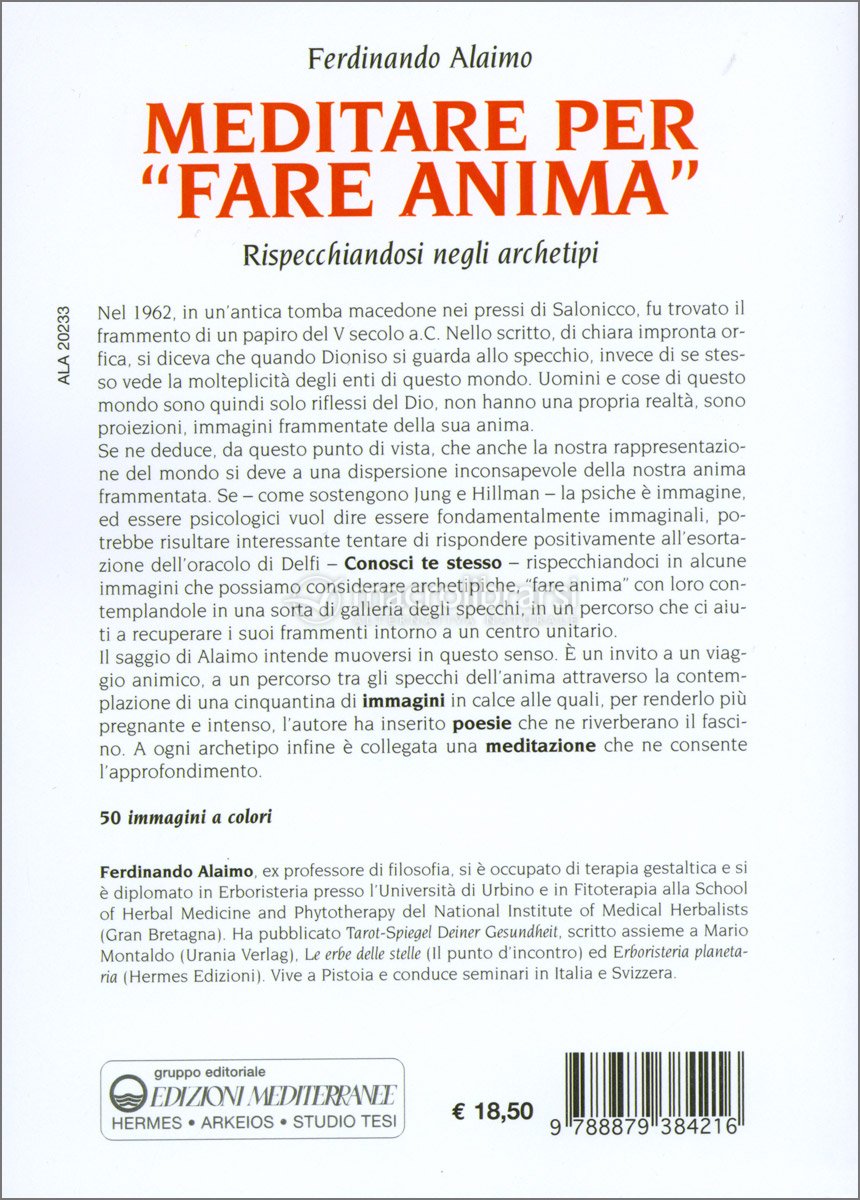 Ma è una ricerca destinata all’insuccesso poiché l’anima non è data, l’anima bisogna “farla”. Se, come sostengono in particolare C.G. Jung e J. Hillman, la psiche è immagine, è interessante tentare di rispondere positivamente all’esortazione dell’oracolo di Delfi rispecchiandoci in una galleria di immagini archetipiche (ad esempio, la primavera, l’acqua, il maestro, il bacio, l’uovo cosmico ecc).