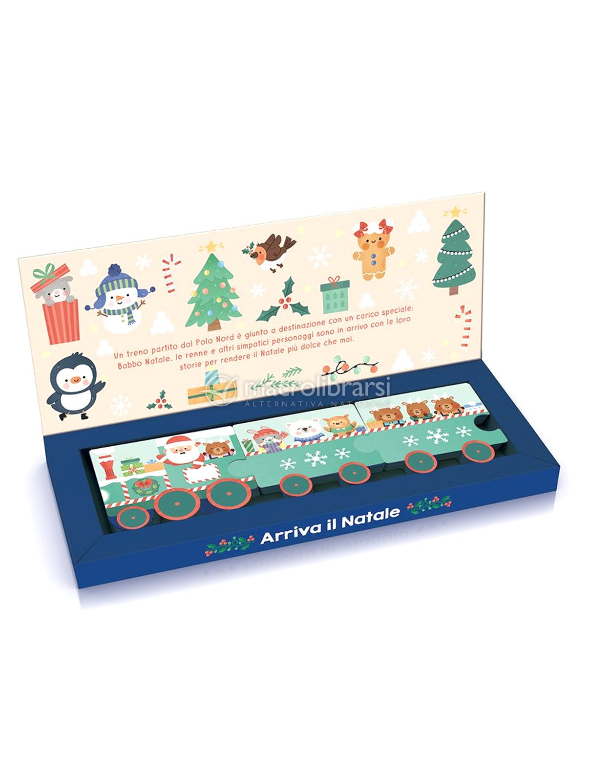 All’interno di una pratica valigetta, si nascondono tre libriccini cartonati e sagomati come tessere di un puzzle che, incastrandosi, formano un trenino carico di amici in partenza dal Polo Nord.