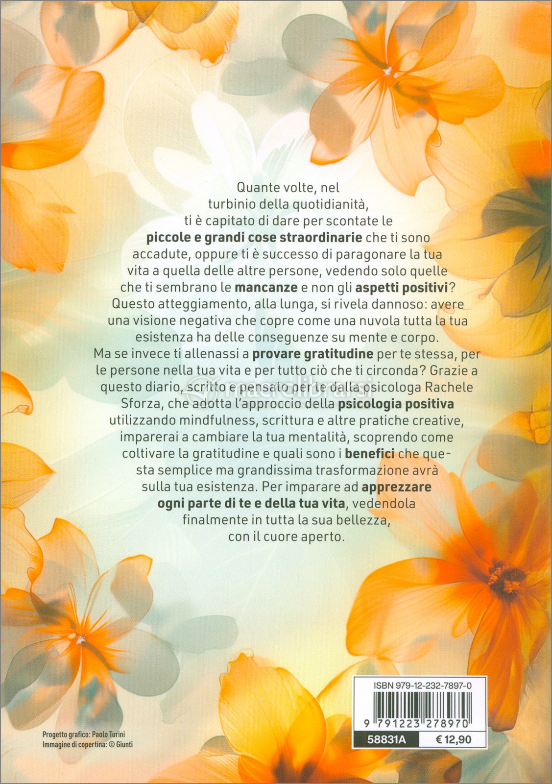 Grazie a questo diario, scritto e pensato per te dalla psicologa Rachele Sforza, che lavora con l'approccio della psicologia positiva utilizzando mindfulness, scrittura e altre pratiche creative, imparerai a cambiare la tua mentalità, scoprendo come coltivare la gratitudine e quali sono i benefici che questa semplice ma grandissima trasformazione avrà sulla tua esistenza.