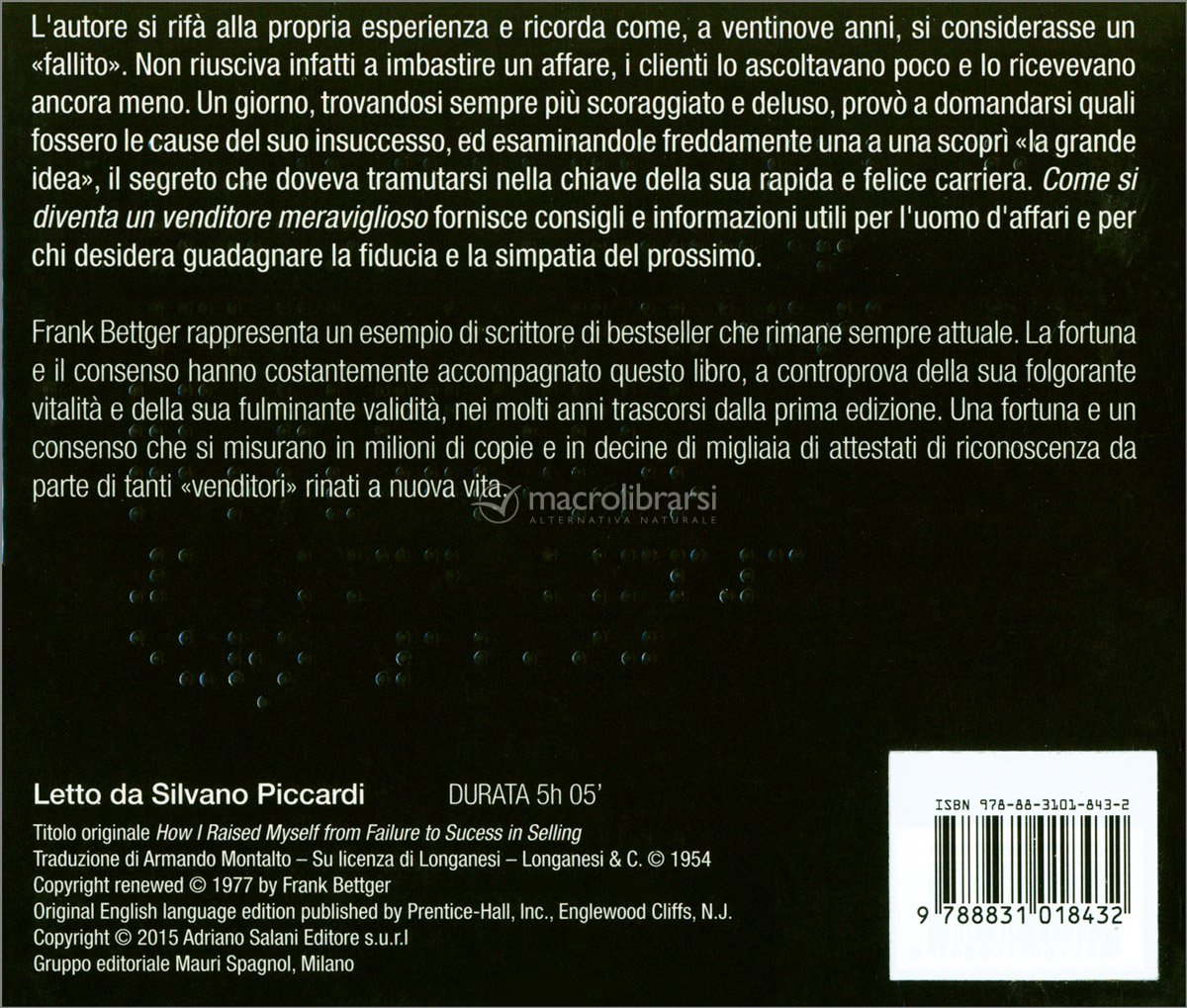 Frank Bettger rappresenta un esempio di scrittore di bestseller che rimane sempre attuale. La fortuna e il consenso hanno costantemente accompagnato questo libro, a controprova della sua folgorante vitalità e della sua fulminante validità, nei molti anni trascorsi dalla prima edizione.