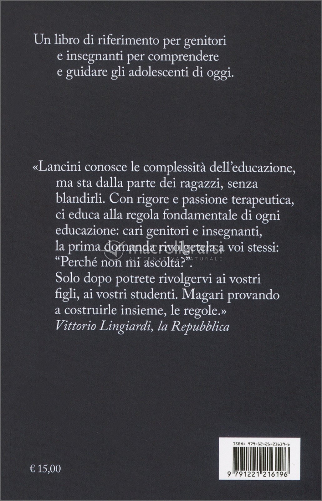 «Lancini conosce le complessità dell'educazione, ma sta dalla parte dei ragazzi, senza blandirli. Con rigore e passione terapeutica, ci educa alla regola fondamentale di ogni educazione: cari genitori e insegnanti, la prima domanda rivolgetela a voi stessi: "Perché non mi ascolta?".