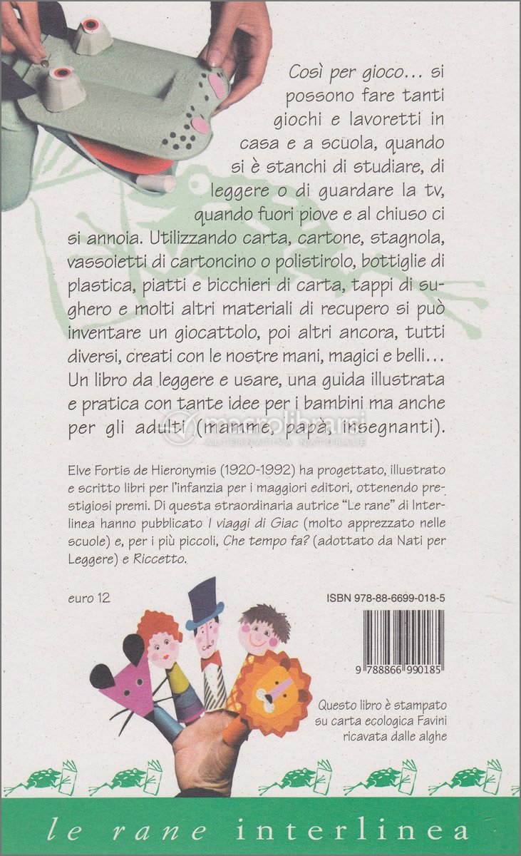 Utilizzando carta, cartone, stagnola, vassoietti di cartoncino o polistirolo, bottiglie di plastica, piatti e bicchieri di carta, tappi di sughero e molti altri materiali di recupero si può inventare un giocattolo, poi altri ancora, tutti diversi, creati con le nostre mani, magici e belli… Un libro da leggere e usare, una guida illustrata e pratica con tante idee per i bambini ma anche per gli adulti (mamme, papà, insegnanti).