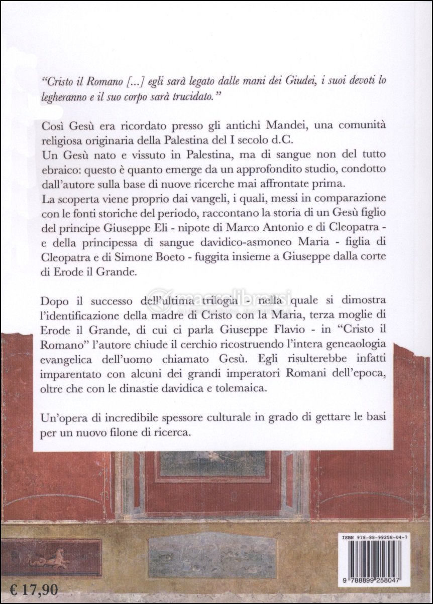Dopo il successo dell'ultima trilogia - nella quale si dimostra l'identificazione della madre di Cristo con la Maria, terza moglie di Erode il Grande, di cui ci parla Giuseppe Flavio - in "Cristo il Romano" l'autore chiude il cerchio ricostruendo l'intera genealogia evangelica dell'uomo chiamato Gesù. Egli risulterebbe infatti imparentato con alcuni dei grandi imperatori Romani dell'epoca, oltre che con le dinastie Davidica e Tolemaica.