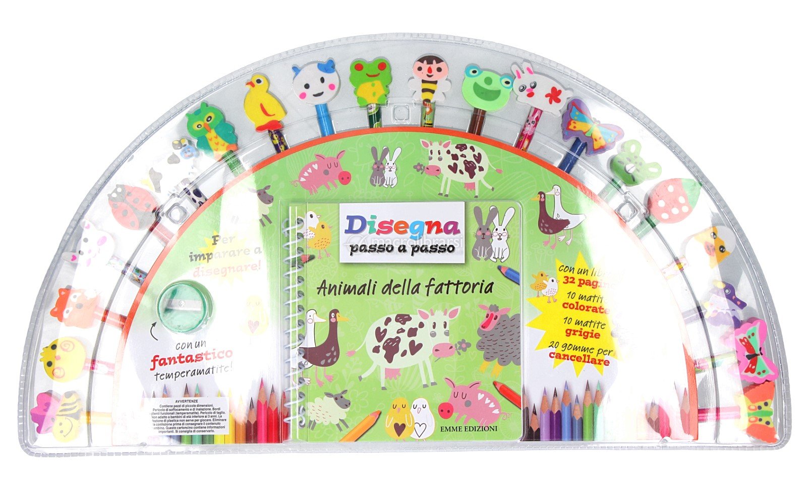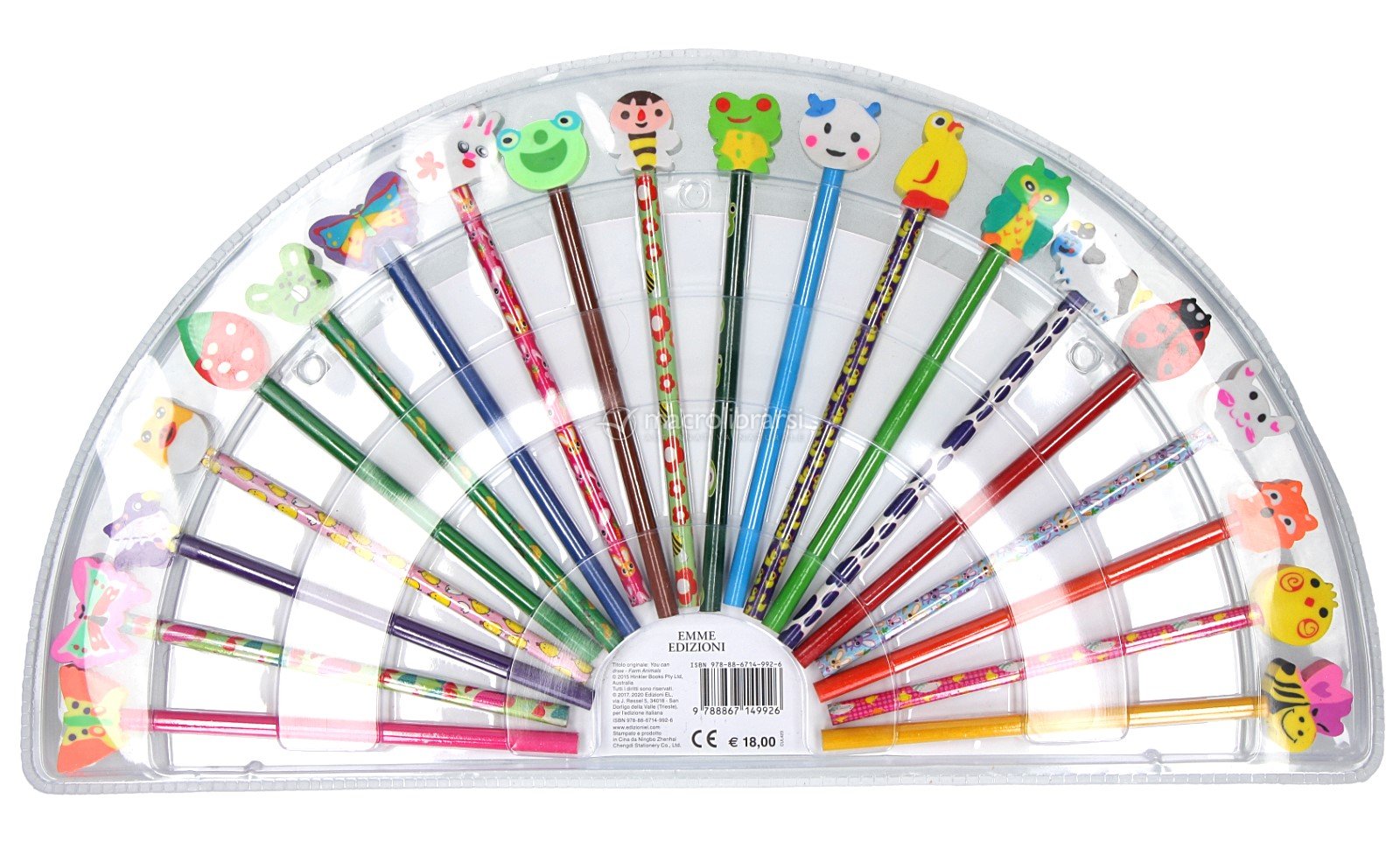| Confezione | 10 matite grigie + 10 matite colorate + 20 gomme sagomate + 1 temperino + istruzioni |