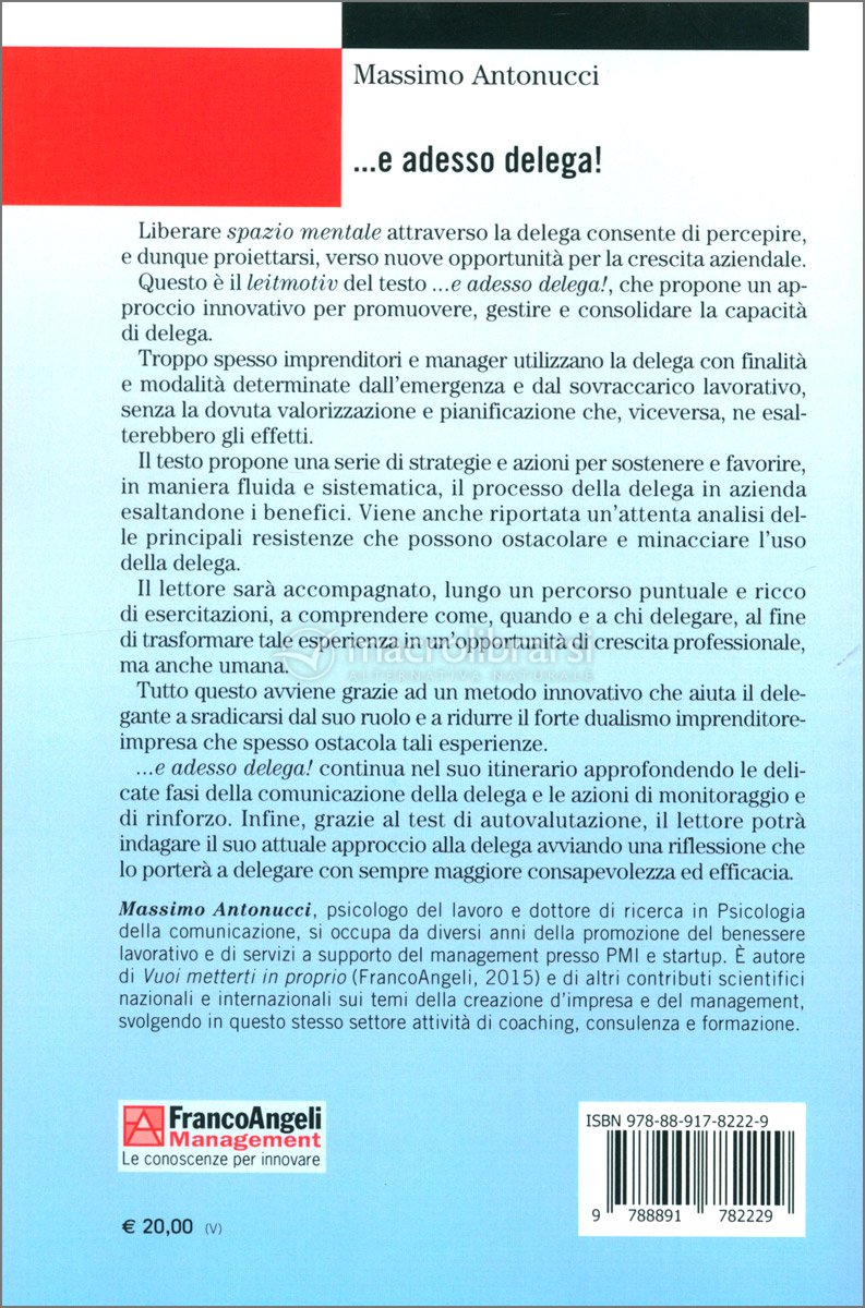 Tutto questo avviene grazie ad un metodo innovativo che aiuta il delegante a sradicarsi dal suo ruolo e a ridurre il forte dualismo imprenditore-impresa che spesso ostacola tali esperienze....e adesso delega! continua nel suo itinerario approfondendo le delicate fasi della comunicazione della delega e le azioni di monitoraggio e di rinforzo. Infine, grazie al test di autovalutazione, il lettore potrà indagare il suo attuale approccio alla delega avviando una riflessione che lo porterà a delegare con sempre maggiore consapevolezza ed efficacia.