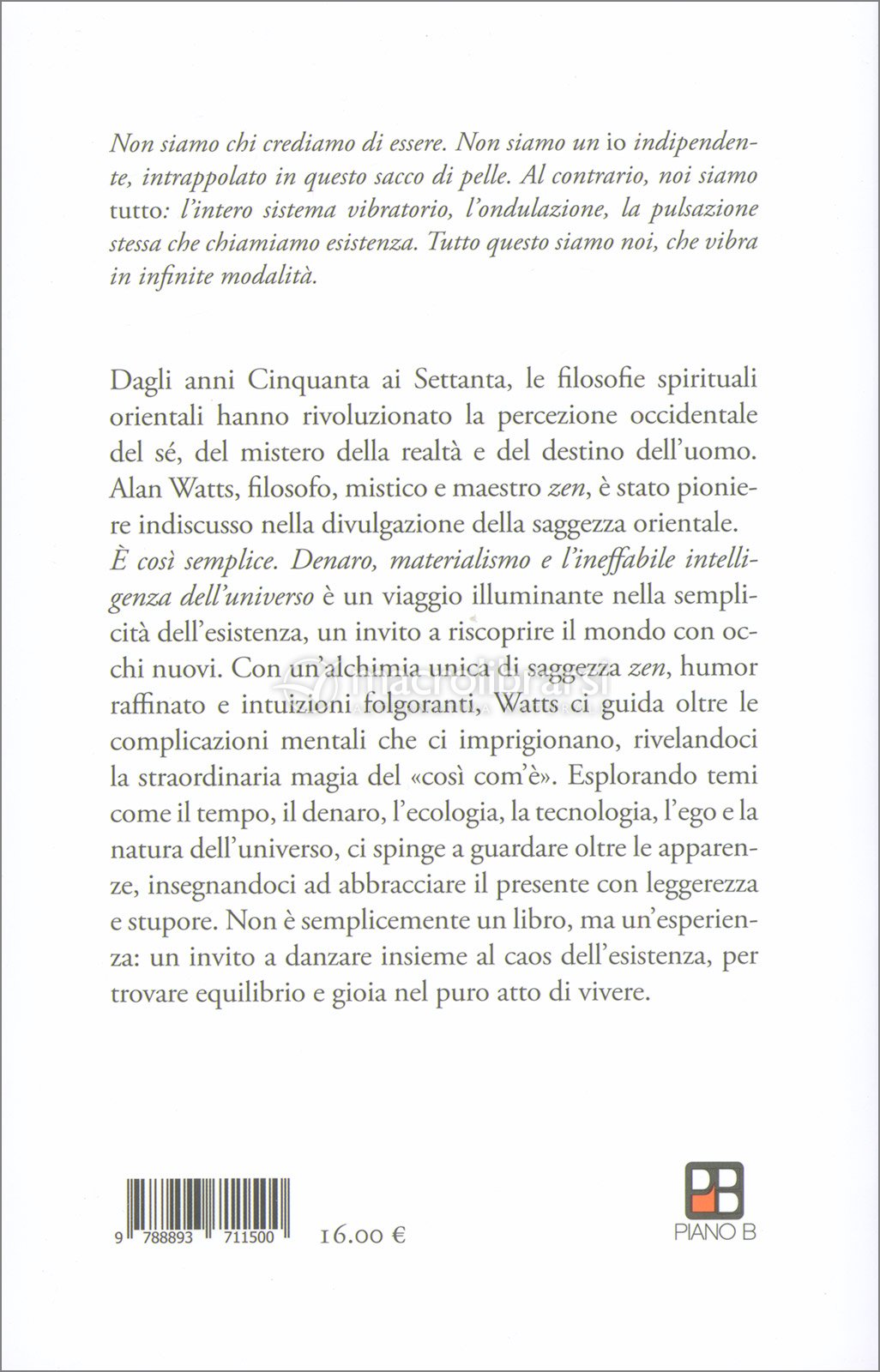 È così semplice. Denaro, materialismo e l’ineffabile intelligenza dell’universo" è un viaggio illuminante nella semplicità dell’esistenza, un invito a riscoprire il mondo con occhi nuovi. Con un’alchimia unica di saggezza zen, humor raffinato e intuizioni folgoranti, Watts ci guida oltre le complicazioni mentali che ci imprigionano, rivelandoci la straordinaria magia del «così com’è».