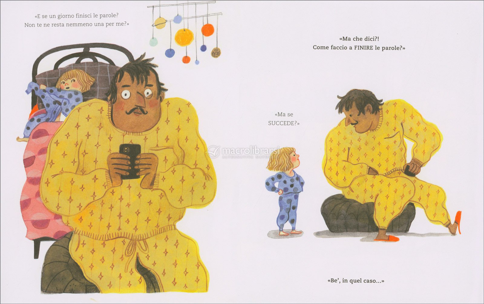 Ma lui, messo di fronte a quel tenero dubbio, è pronto a rassicurarla: solcherà il cielo tra gli artigli di un gufo gigante, costruirà razzi, sfiderà i cattivi, berrà pozioni magiche... qualsiasi cosa pur di assicurarsi una scorta di parole infinita per ricordarle sempre quanto le vuole bene.
