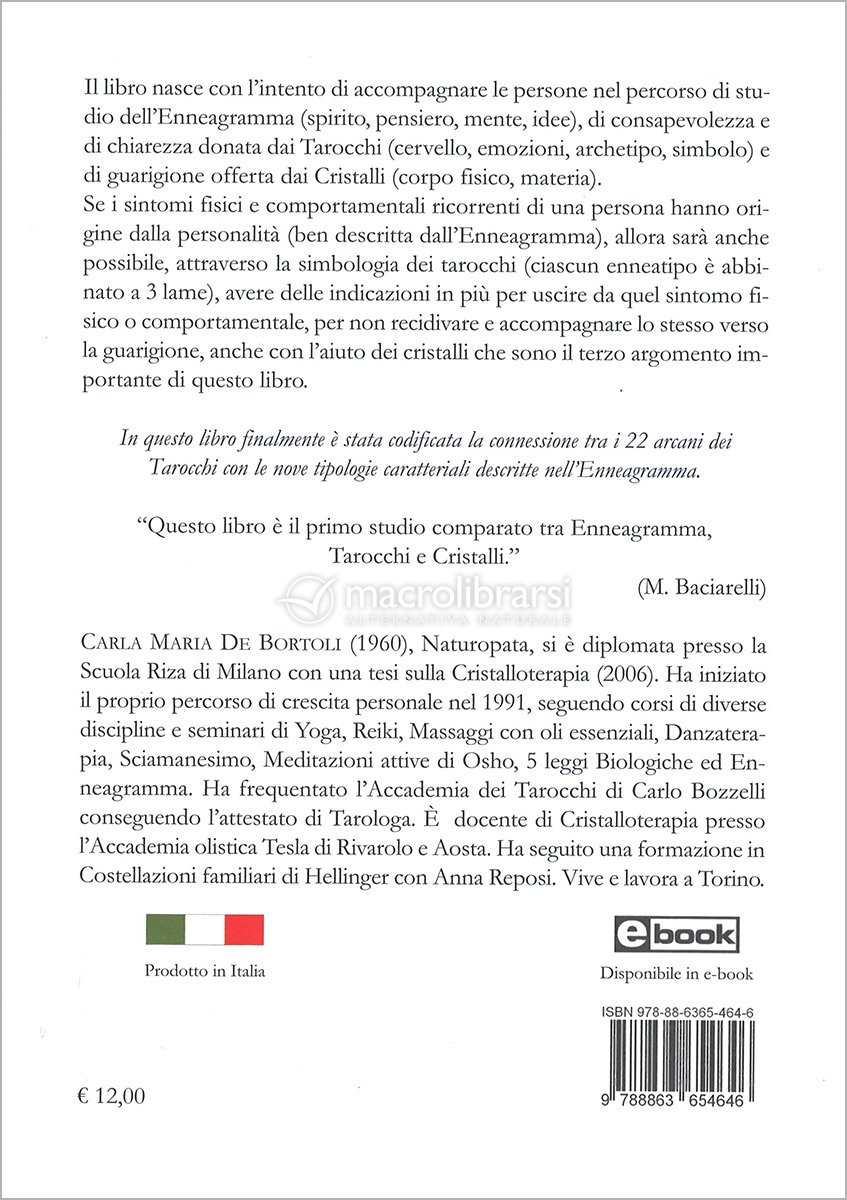 Il libro nasce con l’intento di accompagnare le persone nel percorso di studio dell’Enneagramma (spirito, pensiero, mente, idee), di consapevolezza e di chiarezza donata dai Tarocchi (cervello, emozioni, archetipo, simbolo) e di guarigione offerta dai Cristalli (corpo fisico, materia). Se i sintomi fisici e comportamentali ricorrenti di una persona hanno origine dalla personalità (ben descritta dall’Enneagramma), allora sarà anche possibile, attraverso la simbologia dei tarocchi (ciascun enneatipo è abbinato a 3 lame), avere delle indicazioni in più per uscire da quel sintomo fisico o comportamentale, per non recidivare e accompagnare lo stesso verso la guarigione, anche con l’aiuto dei cristalli che sono il terzo argomento importante di questo libro.