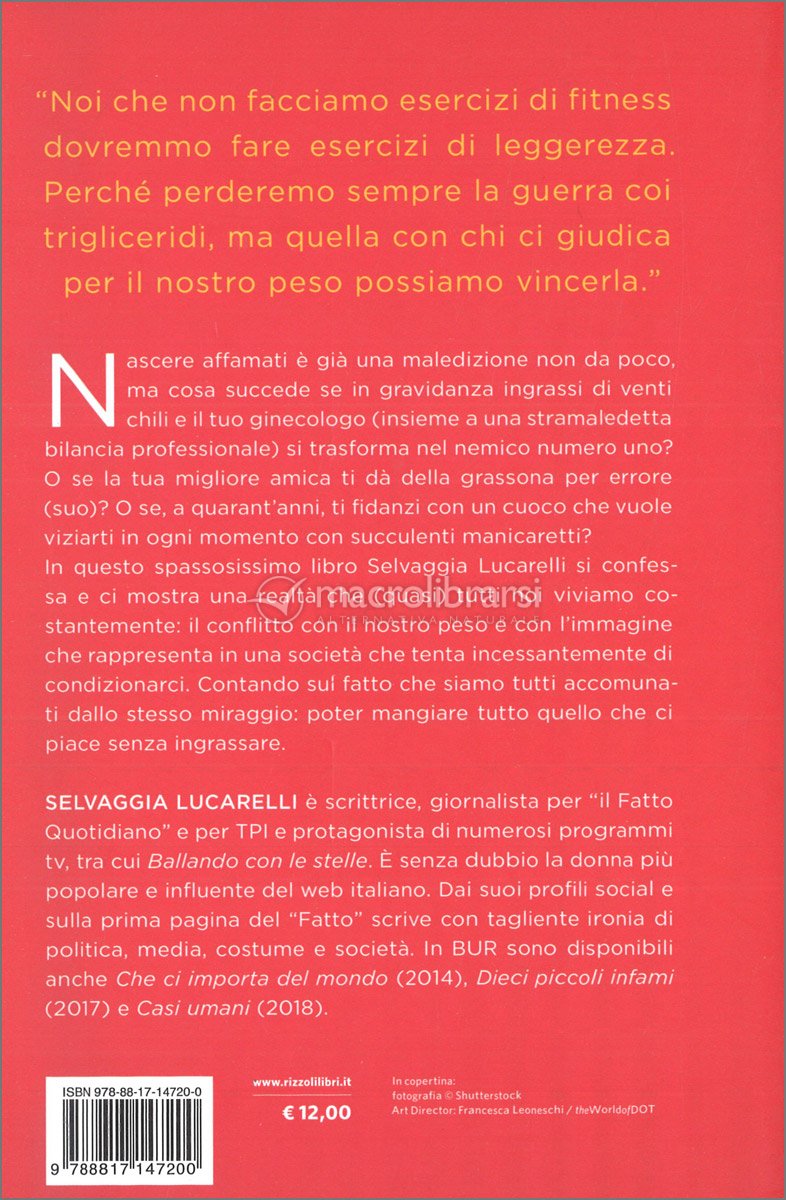 In questo spassoso libro Selvaggia Lucarelli si confessa e ci mostra una realtà che (quasi) tutti noi viviamo costantemente: il conflitto con il nostro peso e con l'immagine che rappresenta in una società che tenta incessantemente di condizionarci. Contando sul fatto che siamo tutti accomunati dallo stesso miraggio: poter mangiare tutto quello che ci piace senza ingrassare.