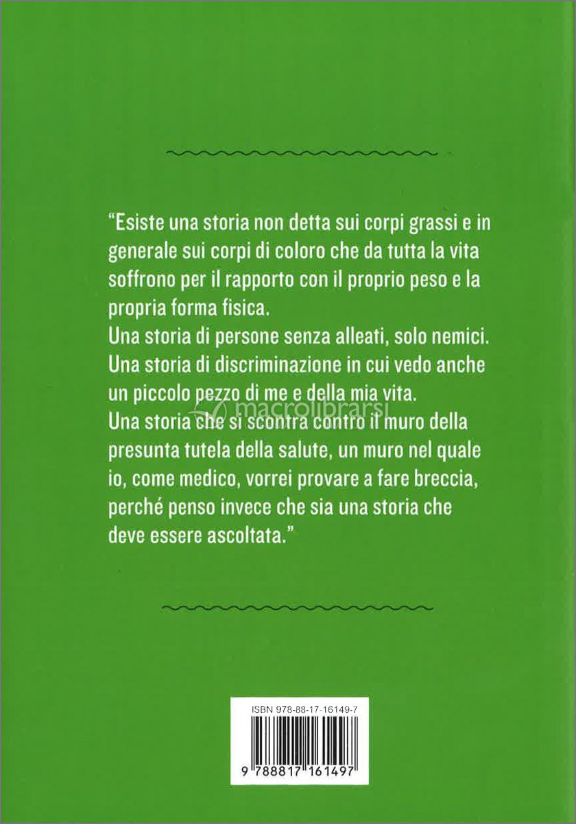 Questo è un libro che vuole essere un alleato, per tante persone con corpi grassi che soffrono o hanno sofferto di disturbi del comportamento alimentare (o entrambe le cose), in cui si parla di scienza e medicina, di stereotipi da abbattere, di assiomi duri a morire, di grandi inganni (le diete), di false credenze (un corpo grasso è un corpo malato). E ci troverete anche delle ricette per ritrovare il contatto con il piacere di cucinare e mangiare, fondamentale per ognuno di noi.