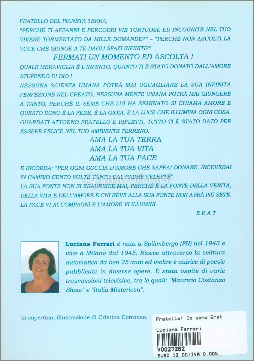 Luciana Ferrari è una scrittrice sensitiva che da più di trent'anni riceve messaggi in P.E.S. (scrittura automatica veloce cosciente) da forze angeliche viventi su altri mondi più evoluti di noi in scienza, ma soprattutto in coscienza.
