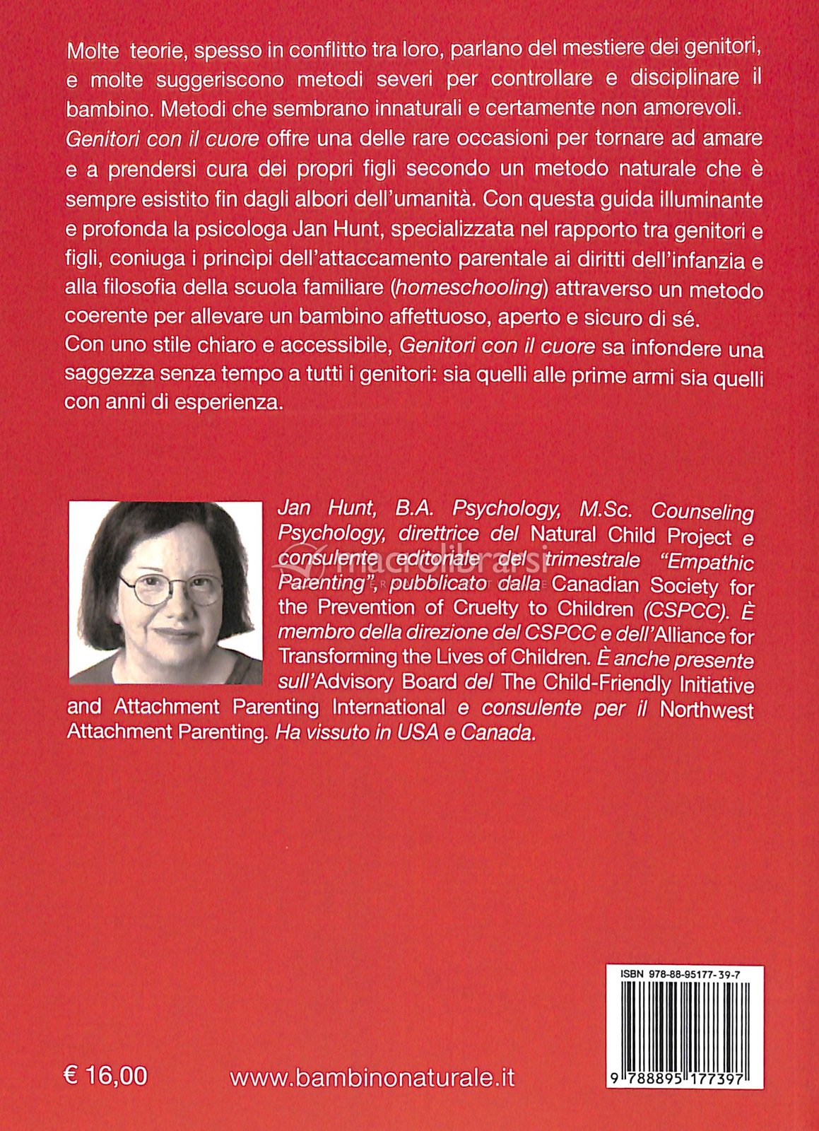 Genitori con il cuore offre una delle rare occasioni per tornare ad amare e a prendersi cura dei propri figli secondo un metodo naturale che è sempre esistito fin dagli albori dell'umanità. Con questa guida illuminante e profonda la psicologa Jan Hunt, specializzata nel rapporto tra genitori e figli, coniuga i princìpi dell'attaccamento parentale ai diritti dell'infanzia e alla filosofia della scuola familiare (homeschooling) attraverso un metodo coerente per allevare un bambino affettuoso, aperto e sicuro di sé.