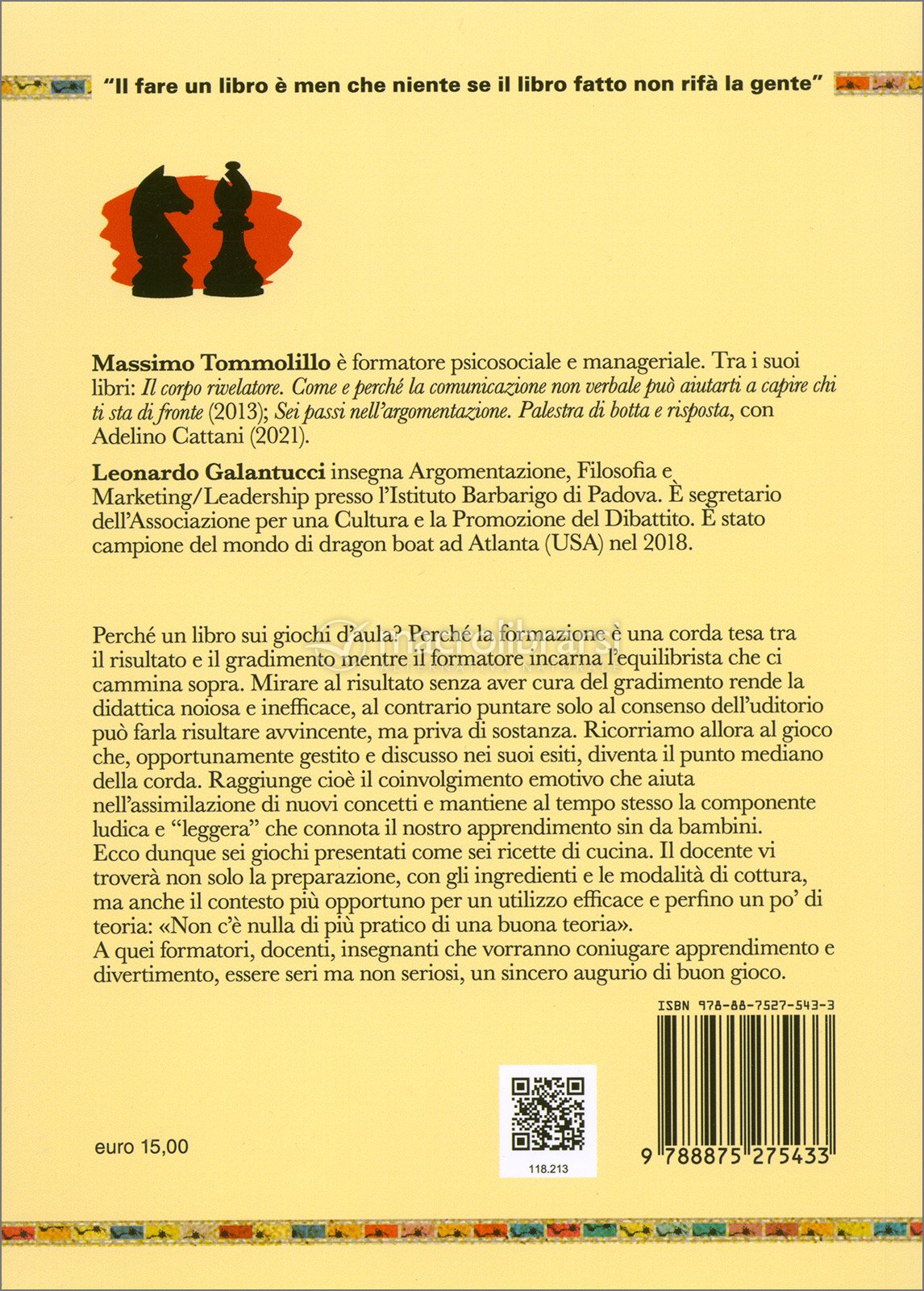 Ecco dunque sei giochi presentati come sei ricette di cucina. Il docente vi troverà non solo la preparazione, con gli ingredienti e le modalità di cottura, ma anche il contesto più opportuno per un utilizzo efficace e perfino un po’ di teoria: «Non c’è nulla di più pratico di una buona teoria».