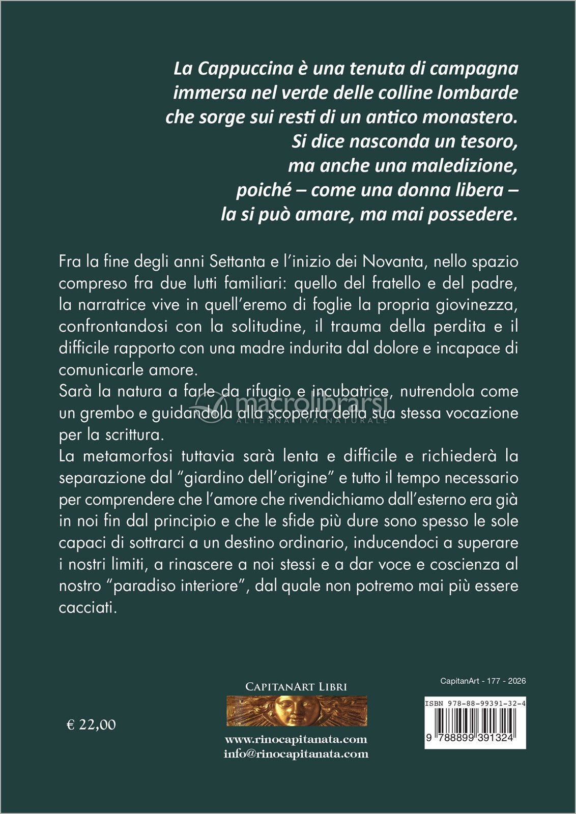 La Cappuccina, con i suoi alberi, i suoi silenzi, i suoi misteri, è una metafora di ciò che ciascun lettore custodisce nella profondità del proprio essere: uno spazio solo suo, dove la natura è ancora intatta, incontaminata, bellissima, a dispetto di ogni apparente separazione.