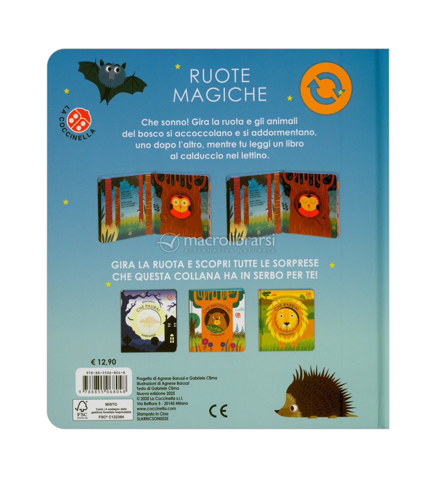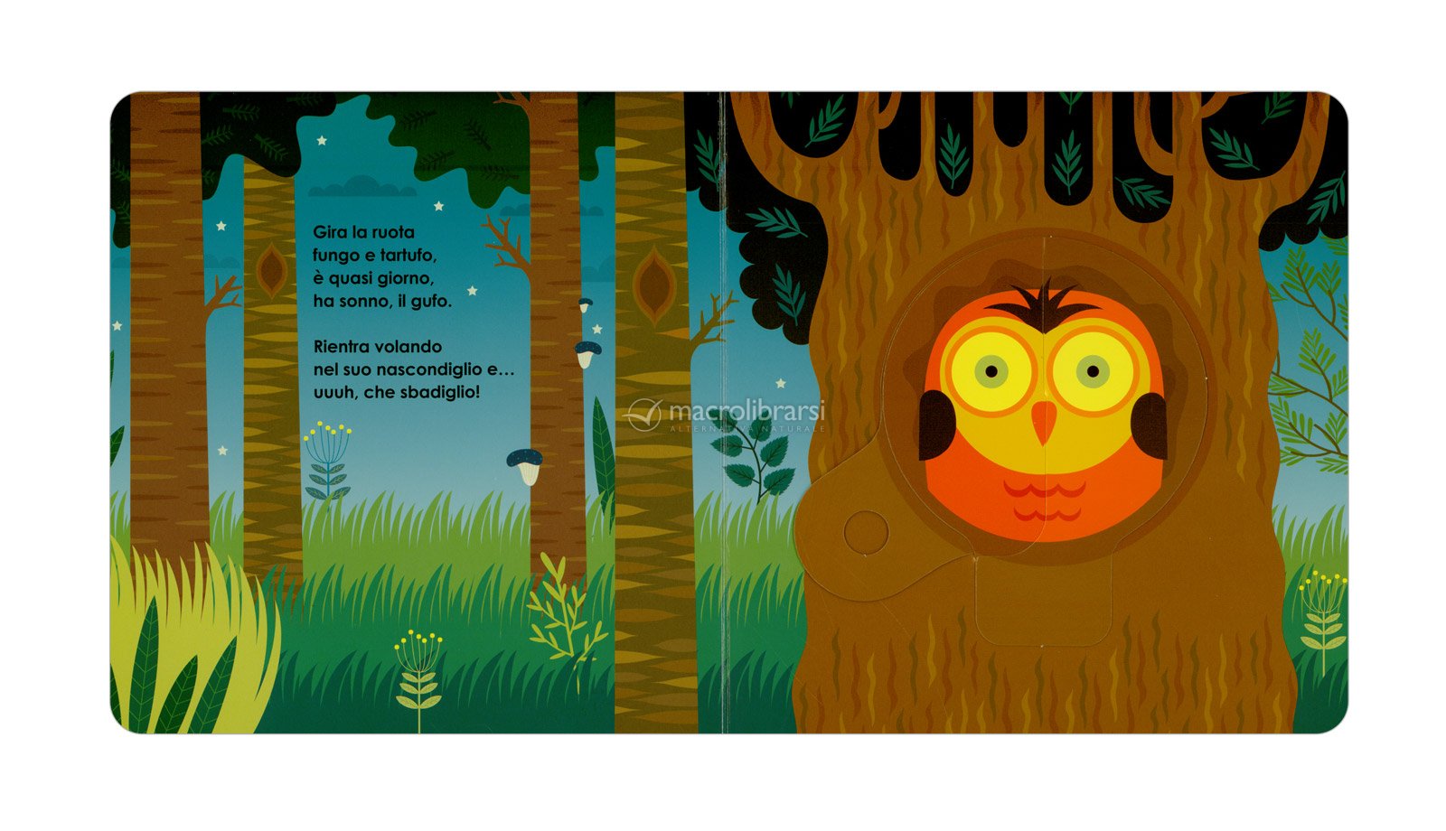 “Gira la ruota e... che sonno!” è un tenero libro interattivo che accompagna i più piccoli nel momento della nanna. Basta un semplice gesto per vedere i disegni cambiare: gli animali della foresta chiudono piano piano gli occhi e si addormentano, uno dopo l’altro, insieme al bambino.