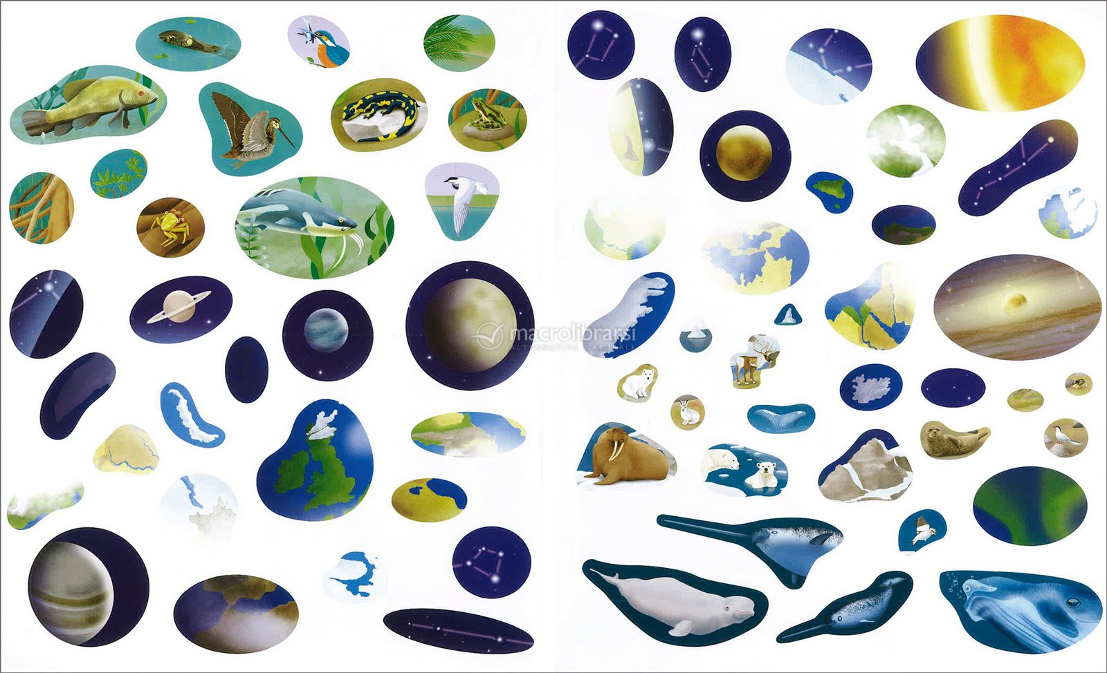 Le tavole a doppia pagina, ricche di dettagli e colori, aprono le porte a diversi ambienti naturali, offrendo uno sguardo ampio e immediato sulla varietà del mondo animale.