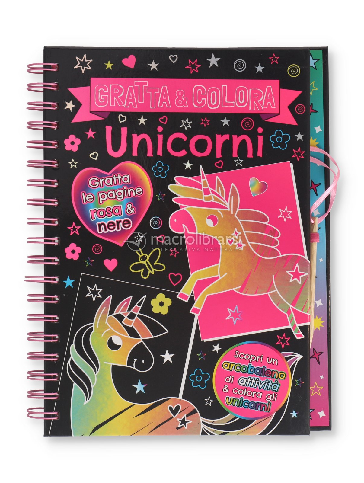 Pagine illustrate in bianco e nero da colorare e pagine ricoperte da una patina nera da grattare via con la matita allegata per scoprire un arcobaleno di colori.