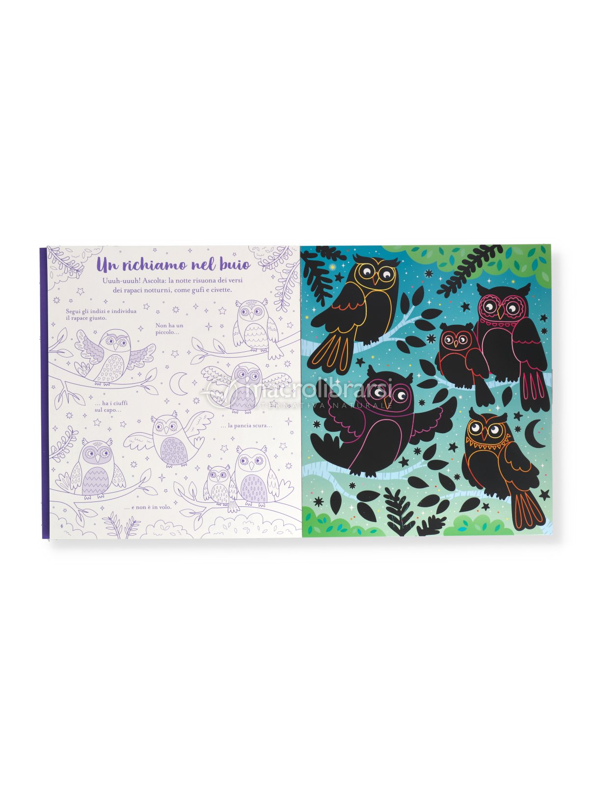 Grazie allo stilo in legno incluso, è possibile grattare la patina scura delle pagine e far comparire, come per magia, splendide illustrazioni e scenette notturne.