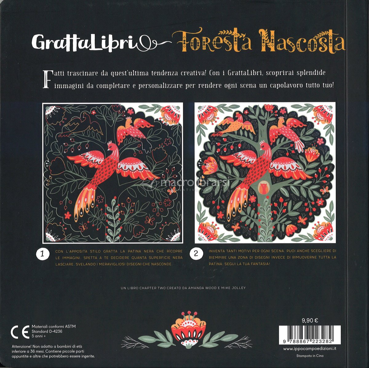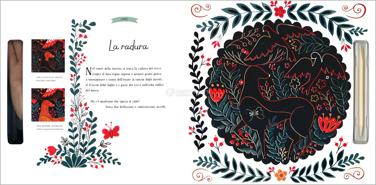 Con l'apposita stilo gratta la patina nera che ricopre le immagini, spetta a te decidere quanta superficie nera lasciare, svelando i meravigliosi disegni che nasconde.