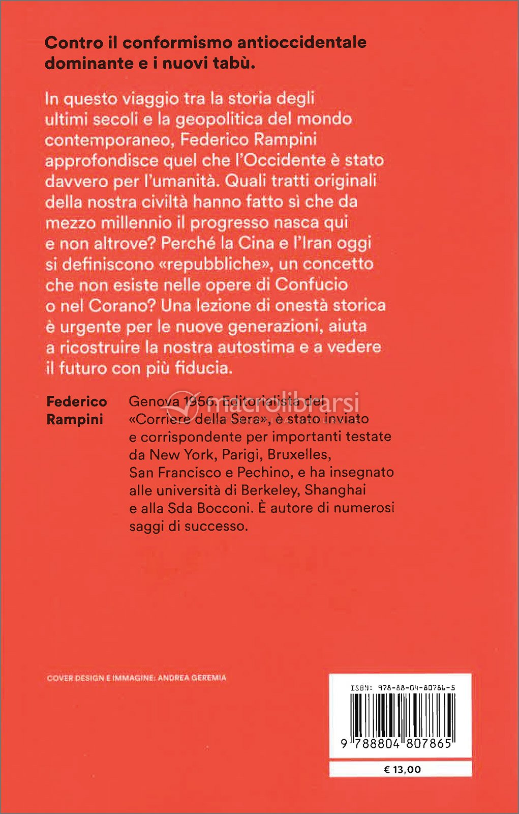 Rampini invita il lettore a guardare con onestà storica all’eredità occidentale, senza idealizzazioni ma nemmeno con un senso di colpa predefinito, mettendo in luce come la scienza, la tecnologia e il pensiero critico siano elementi che hanno plasmato positivamente molte dimensioni della vita collettiva.