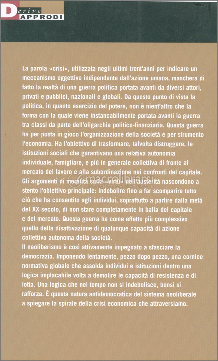 La parola «crisi», utilizzata negli ultimi trent’anni per indicare un meccanismo oggettivo indipendente dall’azione umana, maschera di fatto la realtà di una guerra politica portata avanti da diversi attori, privati e pubblici, nazionali e globali. Da questo punto di vista la politica, in quanto esercizio del potere, non è nient’altro che la forma con la quale viene instancabilmente portata avanti la guerra tra classi da parte dell’oligarchia politico-finanziaria.