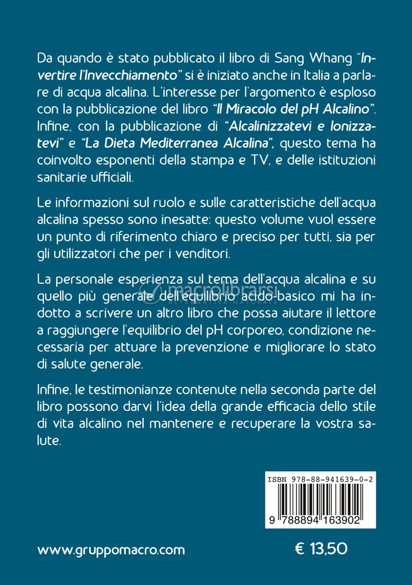 Da quando è stato pubblicato il libro di Sang Whang "Invertire l'Invecchiamento" si è iniziato anche in Italia a parlare di acqua alcalina. L'interesse per l'argomento è esploso con la pubblicazione del libro "Il Miracolo del pH Alcalino". Infine, con la pubblicazione di "Alcalinizzatevi e Ionizzatevi" e "La Dieta Mediterranea Alcalina", questo tema ha coinvolto esponenti della stampa e TV, e delle istituzioni sanitarie ufficiali.