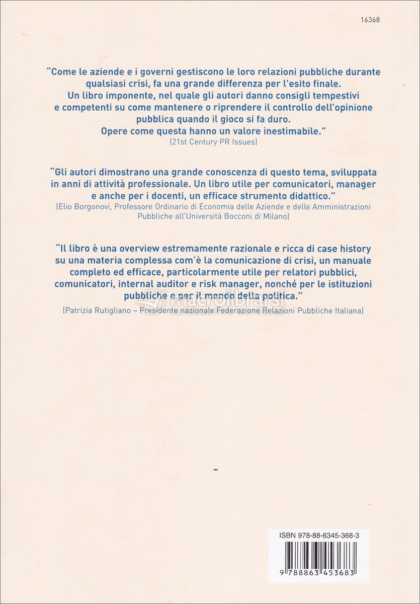 Questa guida contiene un approfondito inquadramento teorico e un ampio ventaglio di case history pratiche sulla comunicazione di crisi e sul crisis management (da E. Leclerc a Coca Cola, da Air France a Sony, da WikiLeaks a ThyssenKrupp, British Petroleum, allo scandalo pedofilia in Vaticano ecc.).