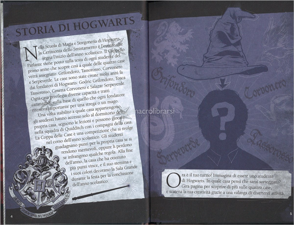 Inoltre troverai la storia delle quattro case di Hogwarts, i racconti sulle loro imprese e i profili degli studenti più famosi, così come un approfondimento sul Quidditch e un registro per annotare i punti conquistati dalle case nel corso dell’anno.