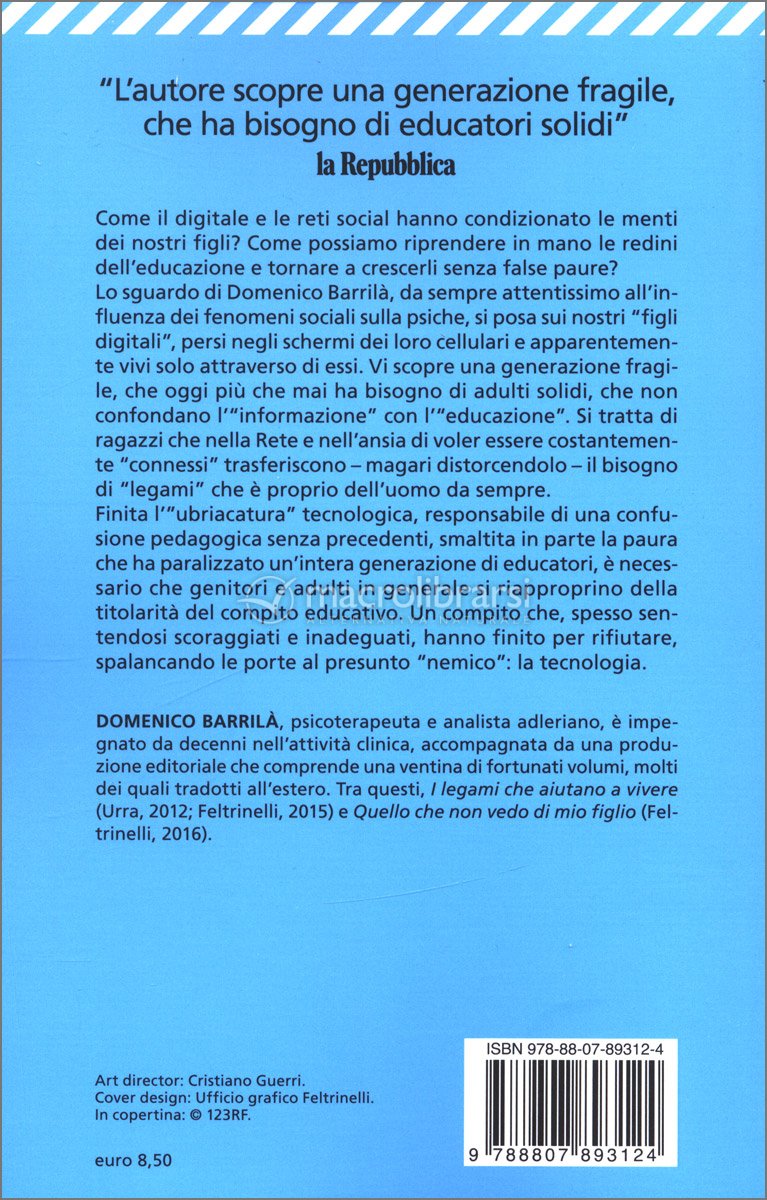 Lo sguardo di Domenico Barrilà, da sempre attentissimo all’influenza dei fenomeni sociali sulla psiche, si posa sui nostri “figli digitali”, persi negli schermi dei loro cellulari e apparentemente vivi solo attraverso di essi. Vi scopre una generazione fragile, che oggi più che mai ha bisogno di educatori solidi, che non confondano l’“informazione” con l’“educazione”. Si tratta di una generazione che, nella Rete e nel loro voler essere costantemente “connessi”, trasferisce – magari distorcendolo – il bisogno di “legami” che è proprio dell’uomo da sempre.