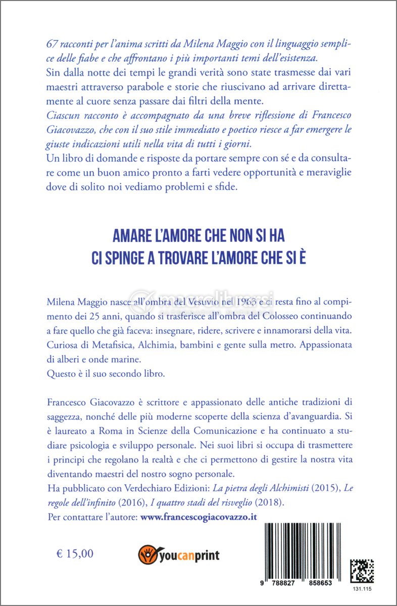 Un libro di brevi racconti, simpatici e scritti in modo accattivante, che vorrebbero veicolare un insegnamento o una riflessione su temi esistenziali. In calce a ciascuno è presente una chiosa, che a volte spiega il concetto suggerito dal racconto, a volte vi aggiunge note a margine, che a mio parere appesantisce inutilmente la lettura senza aggiungere un granché ai contenuti. È un libro piacevole da tenere in bagno o sul comodino, per leggerne una o due storie negli attimi di relax, niente di più. P Ha il merito di essere piuttosto originale nell'approccio, ma ha un taglio un po' troppo new age per i miei gusti. Ritengo che il prezzo sia eccessivo, sia per il numero di pagine che per l'edizione, poco curata.