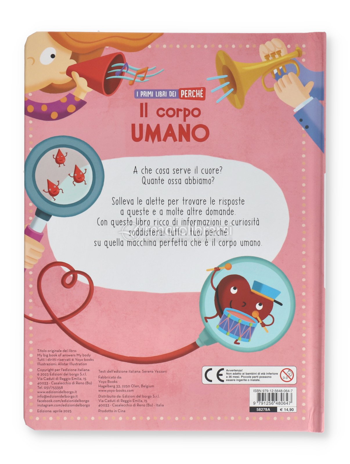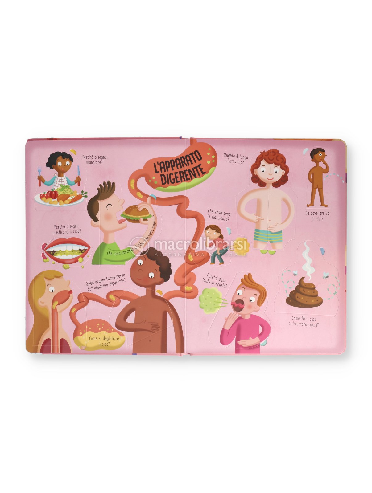 Un libro perfetto per stuzzicare la curiosità dei piccoli lettori e delle piccole lettrici, che potranno scoprire le risposte alle numerose domande sul corpo umano sotto le tante alette presenti in ogni apertura.
