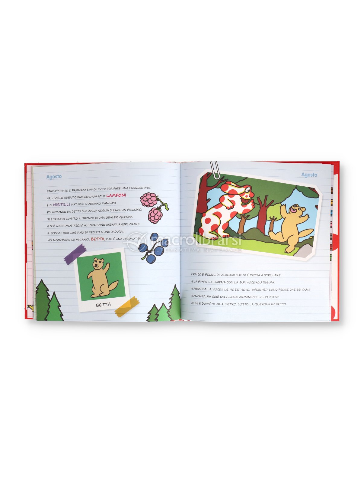 Presente e passato si intrecciano in una narrazione scritta "a mano", con tante foto e disegni attaccati ai fogli a righe, per conoscere meglio la cagnolina a pois rossi, vivere con lei e i suoi amici straordinarie avventure e imparare i mesi dell'anno.