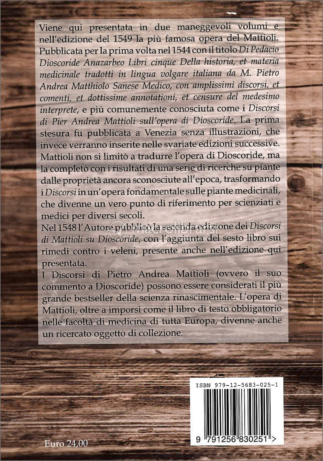Pubblicata per la prima volta nel 1544 con il titolo Di Pedacio Dioscoride Anazarbeo Libri cinque Della historia, et materia medicinale tradotti in lingua volgare italiana da M. Pietro Andrea Matthiolo Sanese Medico, con amplissimi discorsi, et comenti, et dottissime annotationi, et censure del medesimo interprete, e più comunemente conosciuta come i Discorsi di Pier Andrea Mattioli sull’opera di Dioscoride.